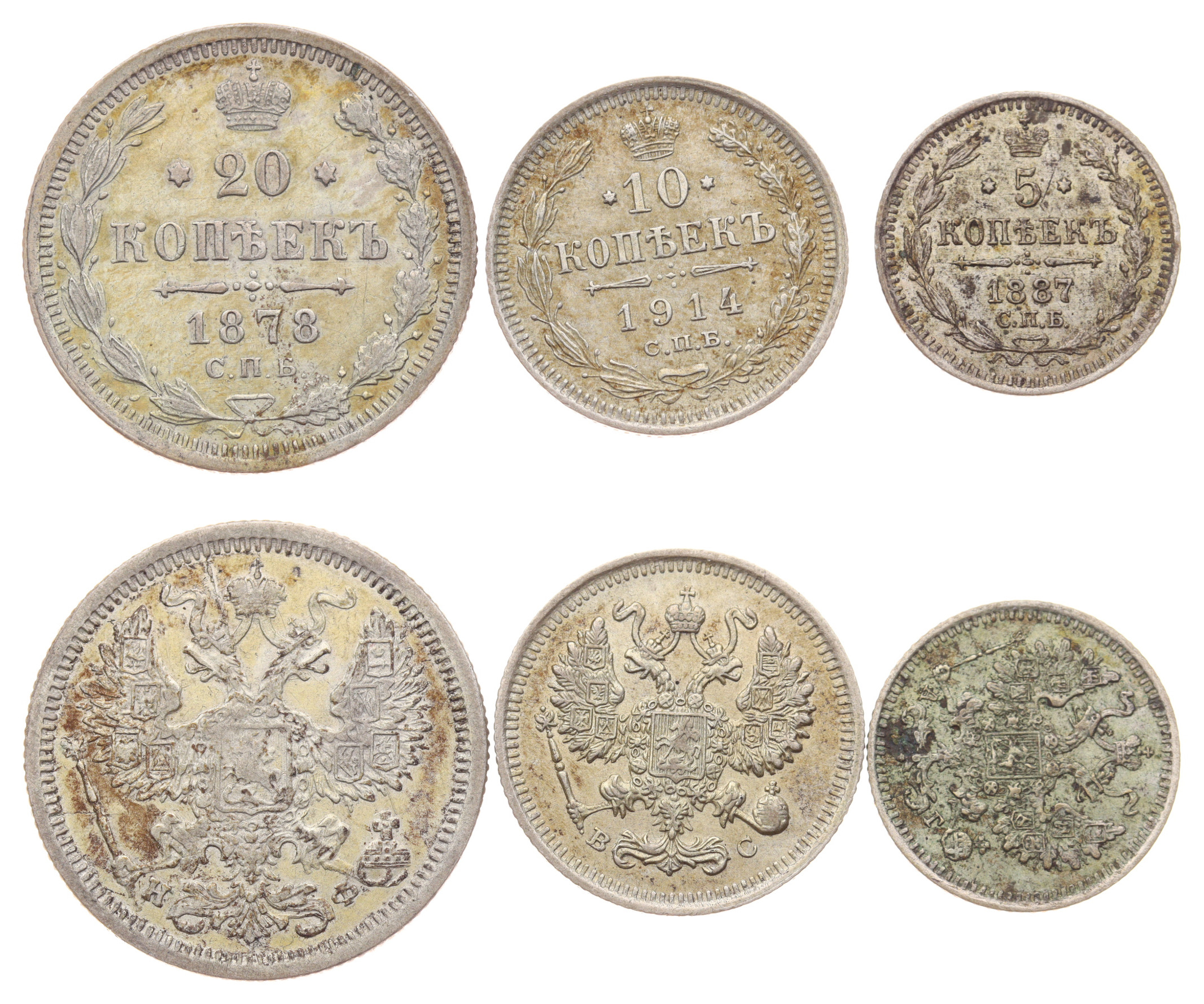 20+10+5 Kopějek, 1878/1914/1887, Ag mince, stavy 1-2, viz autentické foto