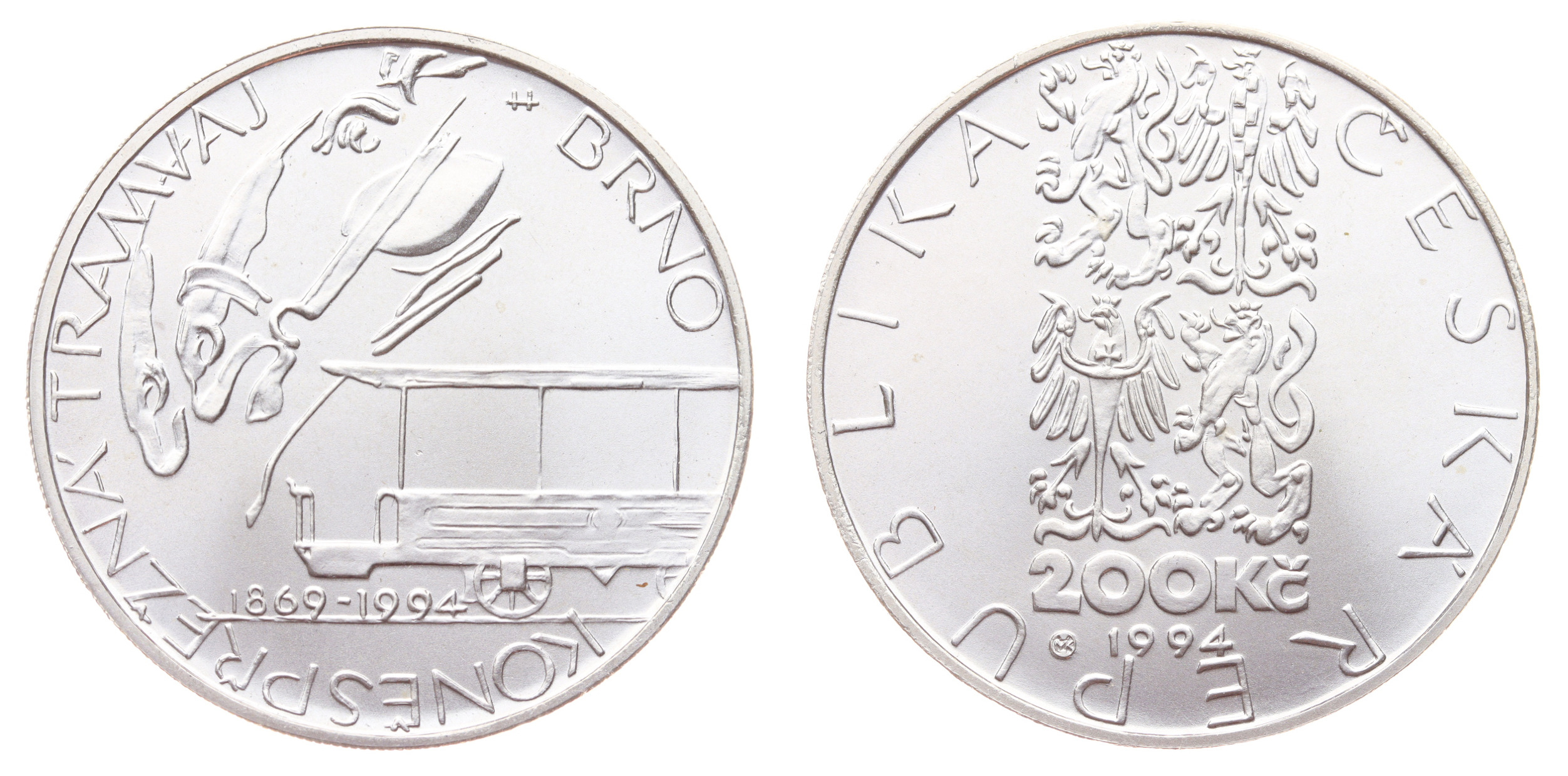 200 Koruna, 1994, Koněspřežná tramvaj v Brně, Ag mince, ryzost 0,900, váha 13 gramů, Aurea C104. běžná jakost, bez certifikátu, kapsle, ražební lesk, stav 0/0