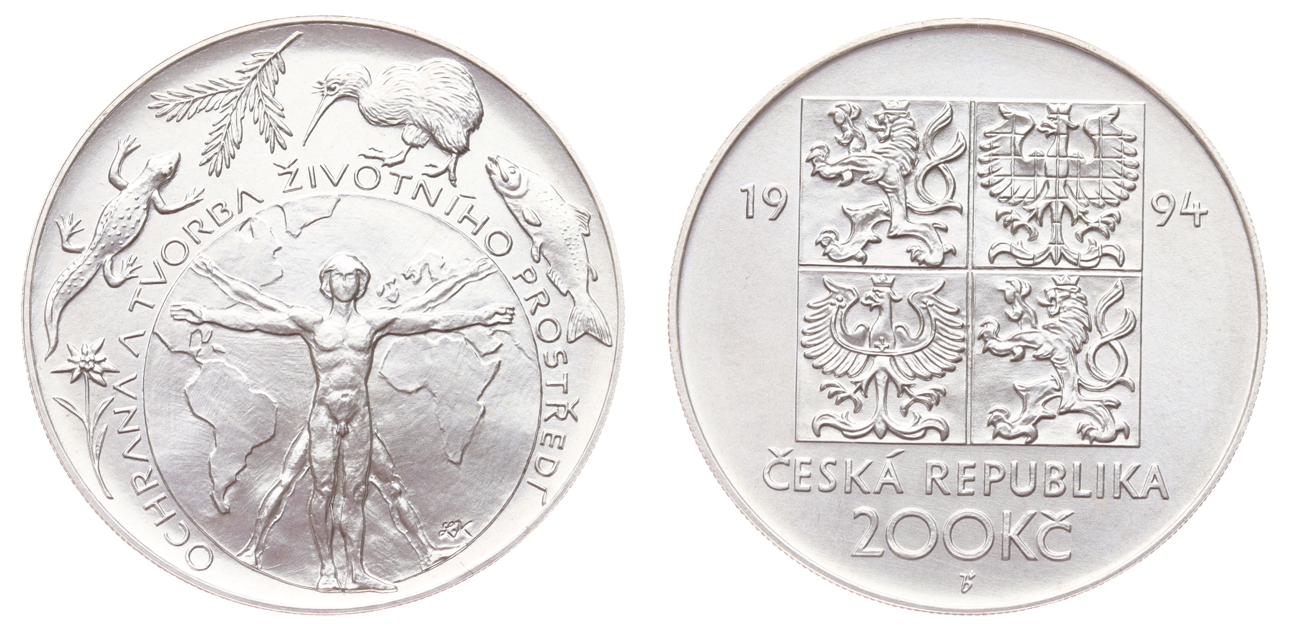 200 Koruna, 1994, Životní prostředí, Ag mince, ryzost 0,900, váha 13 gramů, Aurea C105. běžná jakost, bez certifikátu, kapsle, ražební lesk, stav 0/0