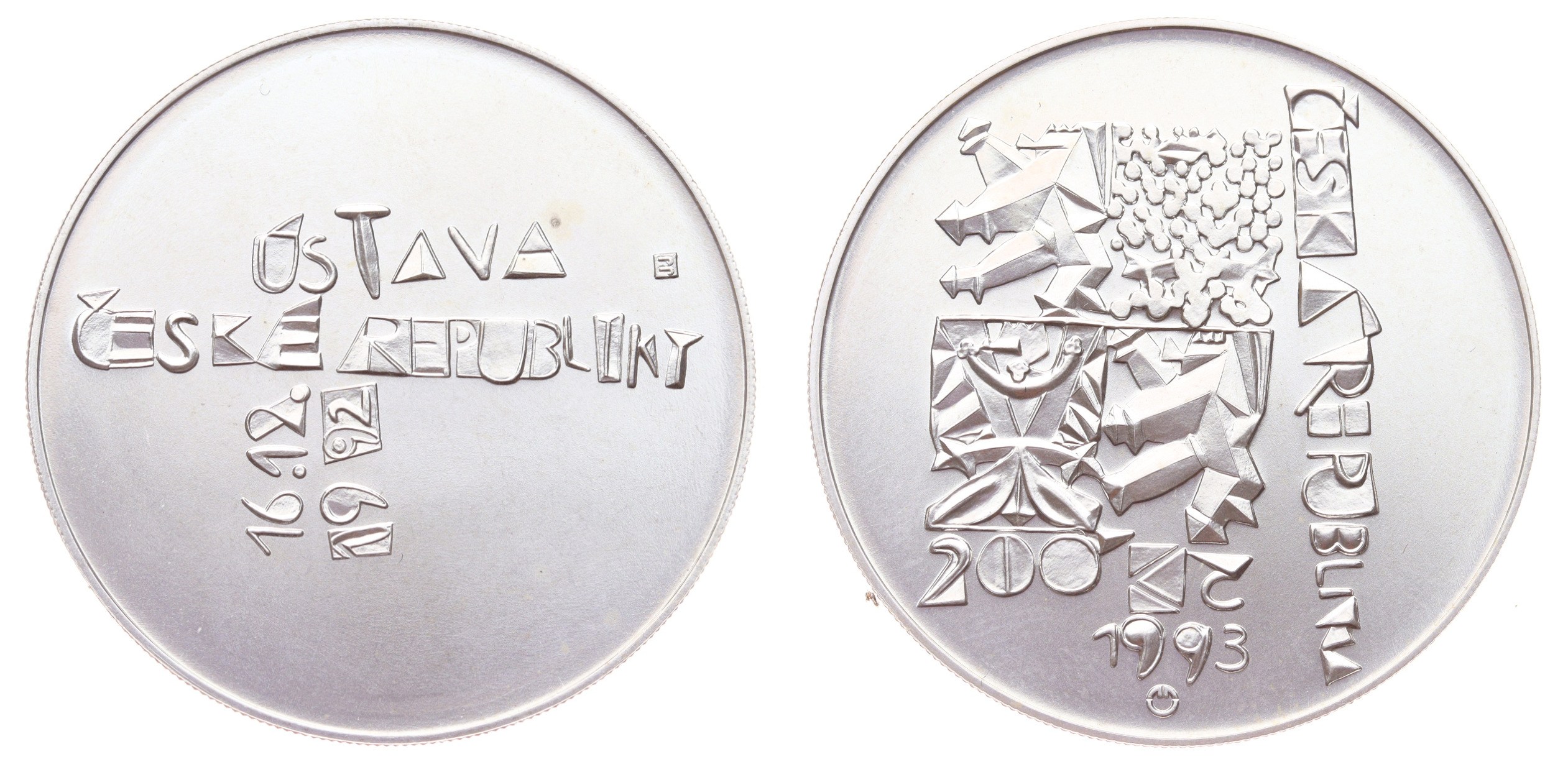 200 Koruna, 1993, Ústava ČR, Ag mince, ryzost 0,900, váha 13 gramů, Aurea C101. běžná jakost, bez certifikátu, kapsle, ražební lesk, stav 0/0