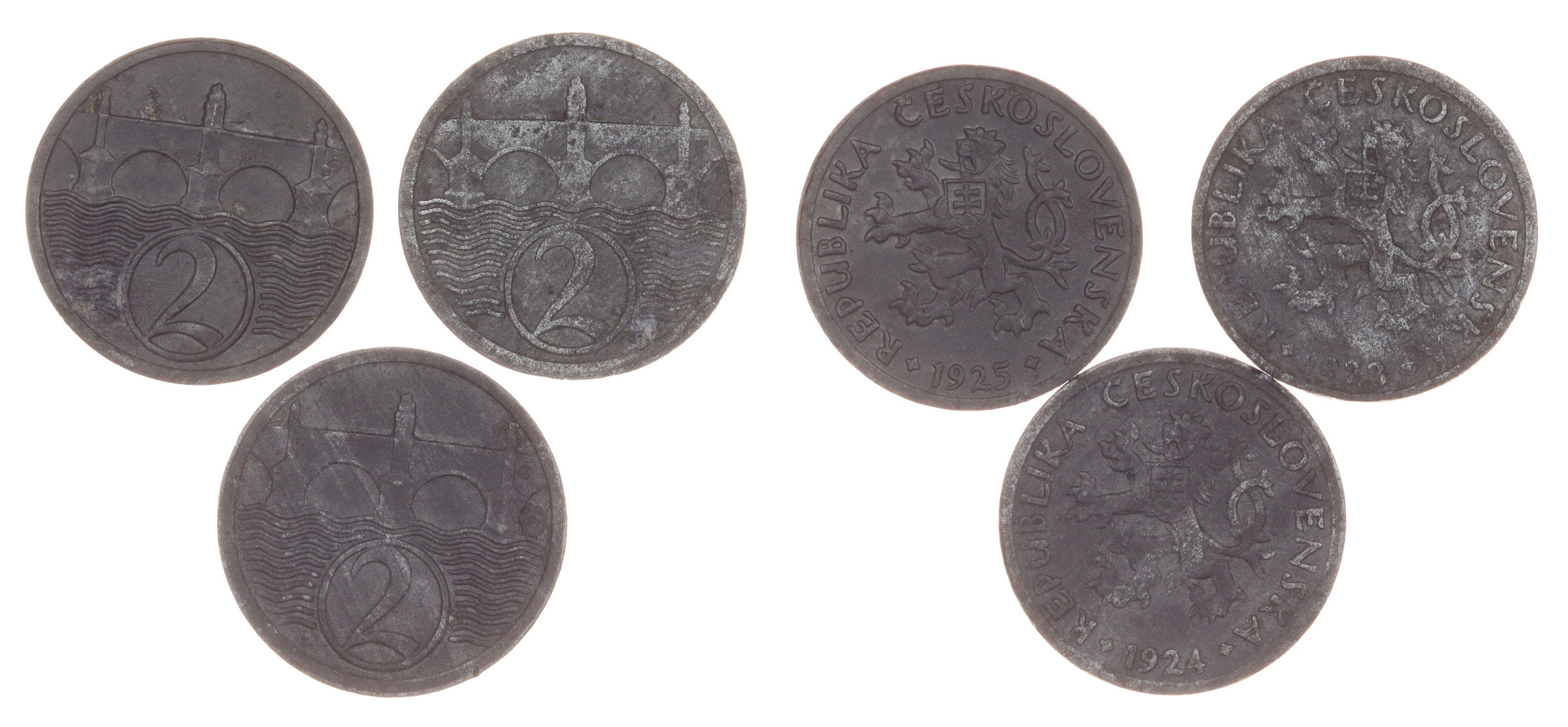 3 kusy mince 2 Haléř, 1923, 1924 a 1925, váha á 2 gramy, Aurea 1, stavy 1-oběhové, stav viz autentické foto