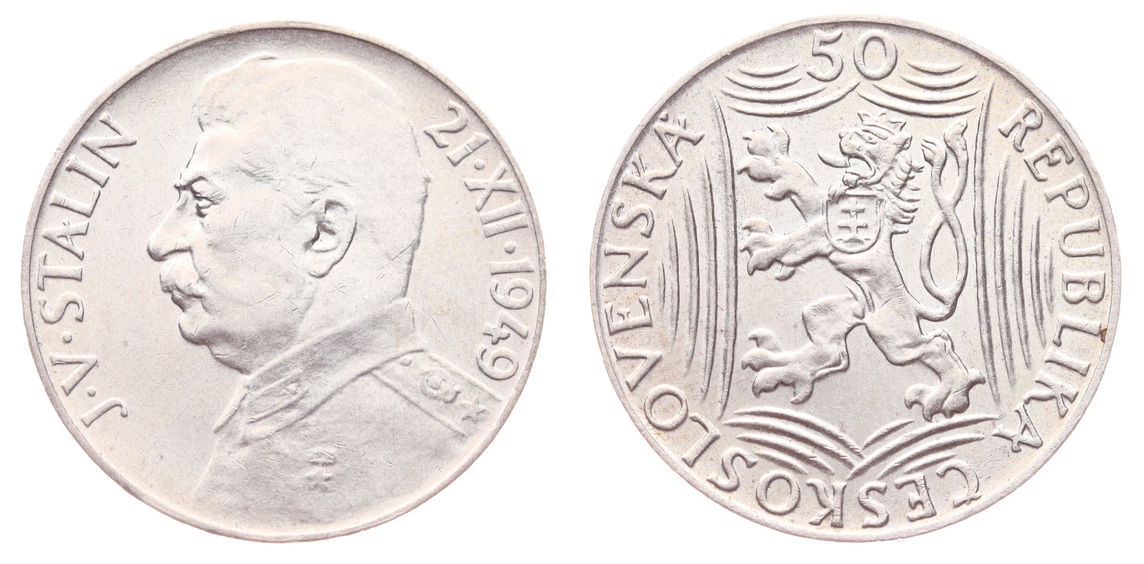 50 Koruna, 1949, J.V.Stalin, Ag mince, ryzost 0,500, váha 10 gramů, Aurea 49, kapsle, ražební lesk, stav 0/0