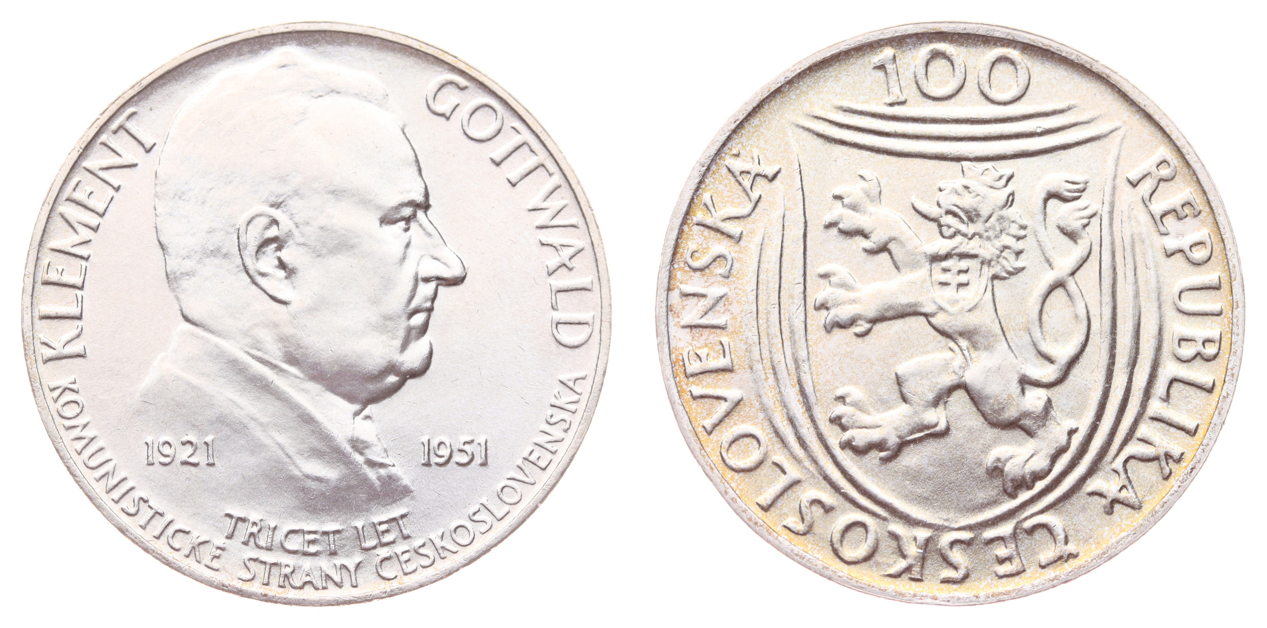 100 Koruna, 1951, K.Gottwald, Ag mince, ryzost 0,500, váha 14 gramů, Aurea 51, kapsle, ražební lesk, stav 0/0