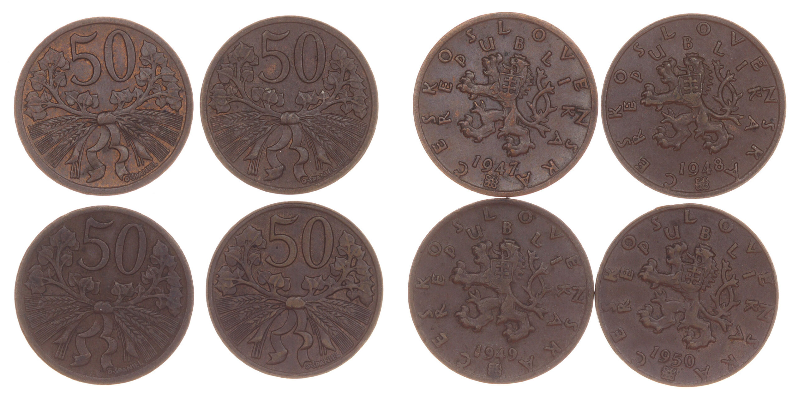 4 kusy mincí 50 Haléř, 1947, 1948, 1949, váha á 3 gramy, Aurea 38, stavy 0-1, viz autentické foto