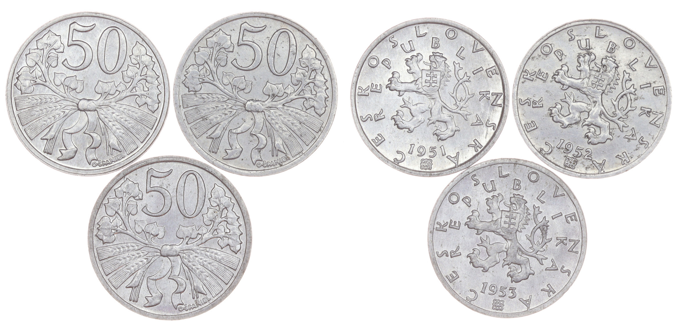 3 kusy mincí 50 Haléř, 1951, 1952 a 1953, váha á 0,67 gramů, Aurea 39, stavy 0-1, viz autentické foto