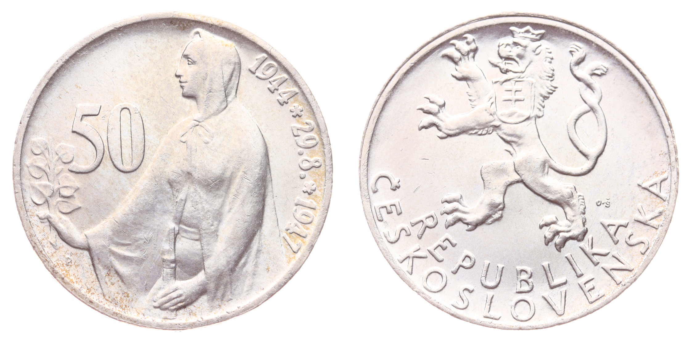 50 Koruna, 1947, Slovenské národní povstání, Ag mince, ryzost 0,500, váha 10 gramů, Aurea 44, kapsle, ražební lesk, stav 0/0