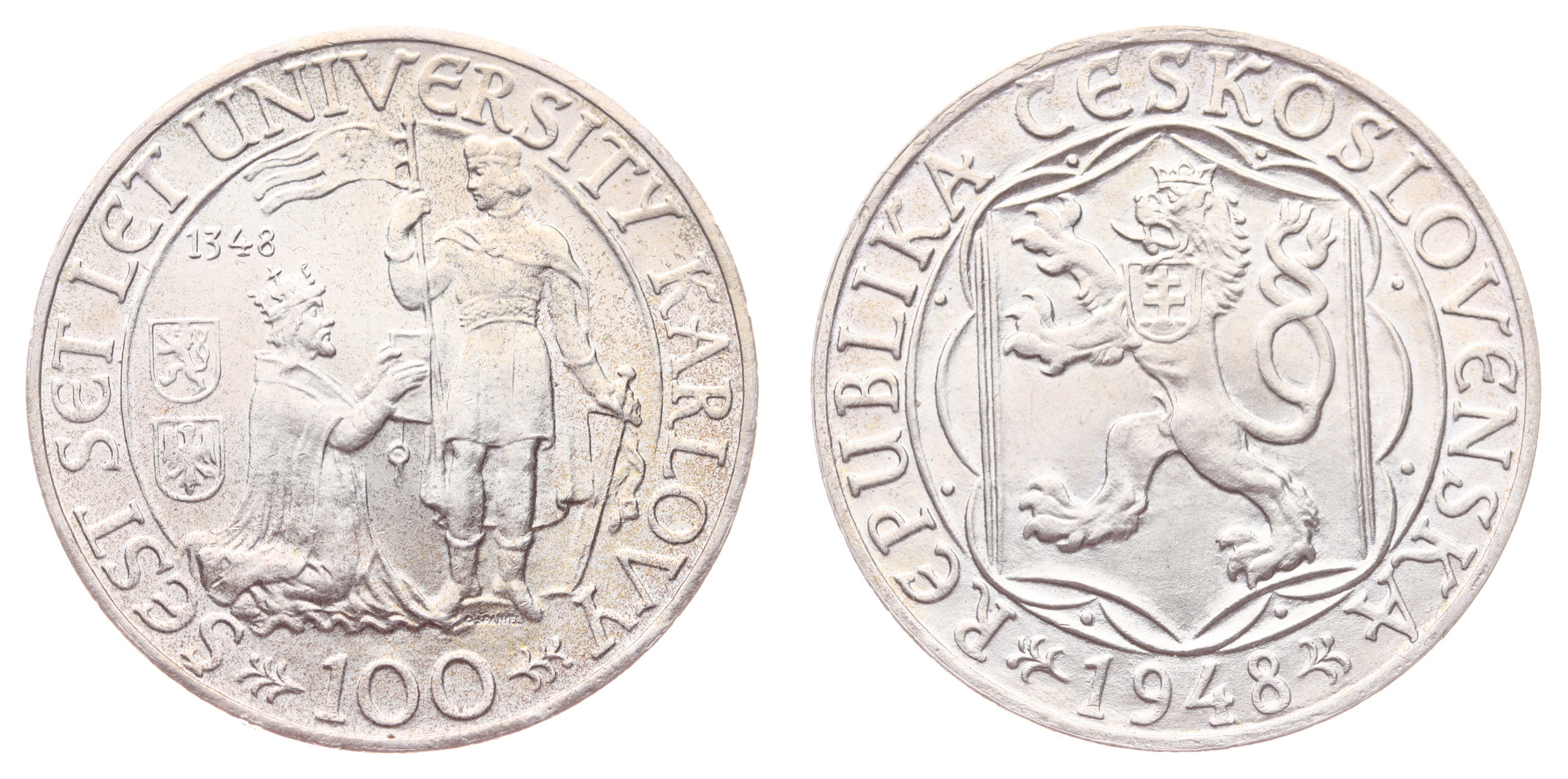 100 Koruna, 1948, Karlova univerzita, Ag mince, ryzost 0,500, váha 14 gramů, Aurea 45, kapsle, ražební lesk, stav 0/0