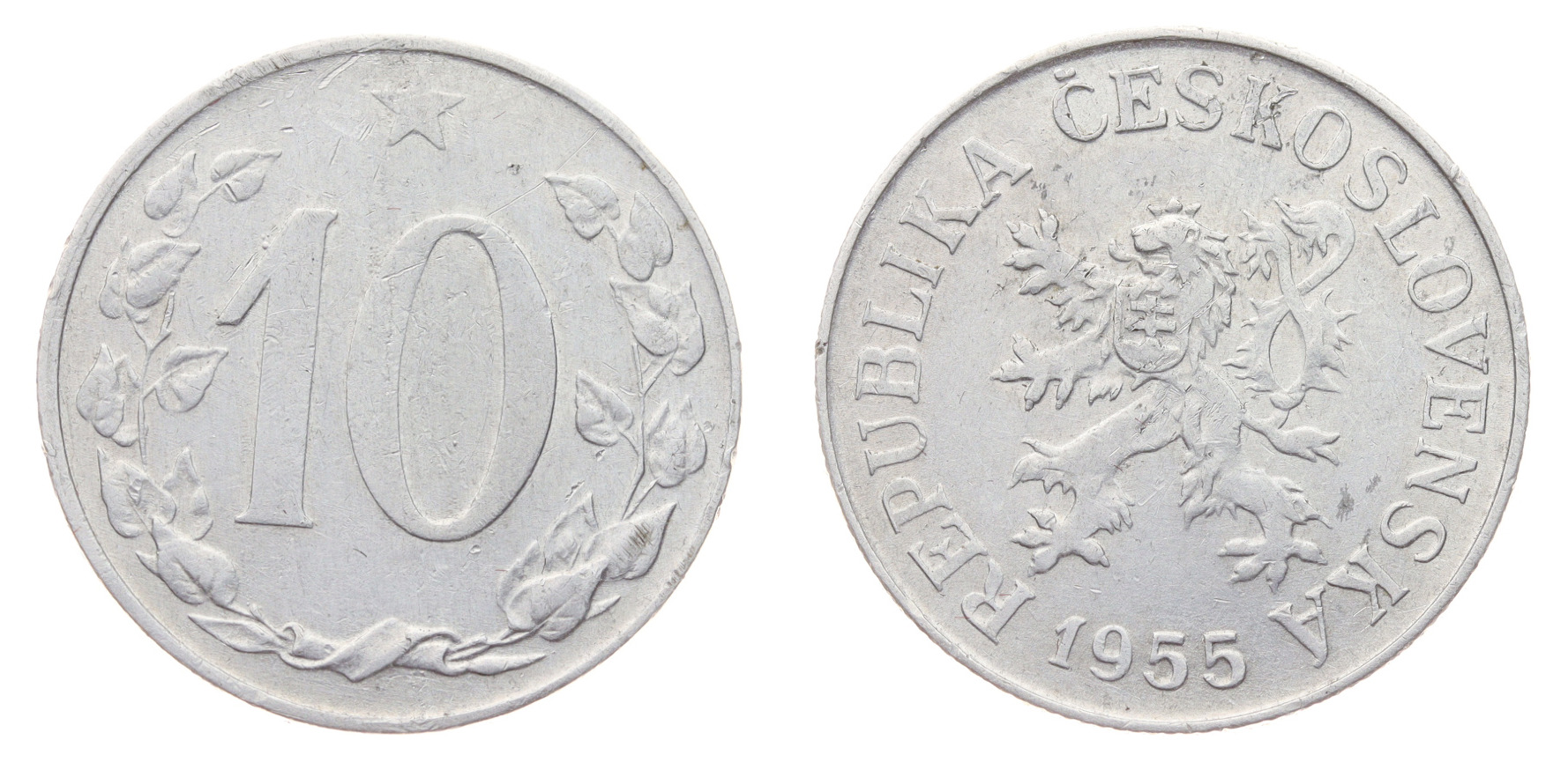 10 Haléř, 1955 (R – vzácný), váha 1,175 gramu, Aurea 65, stav 1/1, stav viz autentické foto