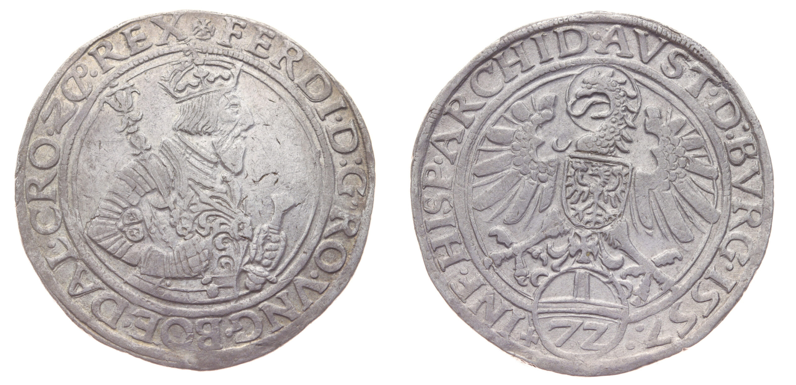 1 Říšský tolar (Reichsthaler), Ag mince (72 Krejcarů), 1557, Hall, váha 30,8 gramů, zcela nepatrá st. po záv. jinak stav 1/1, viz autentické foto