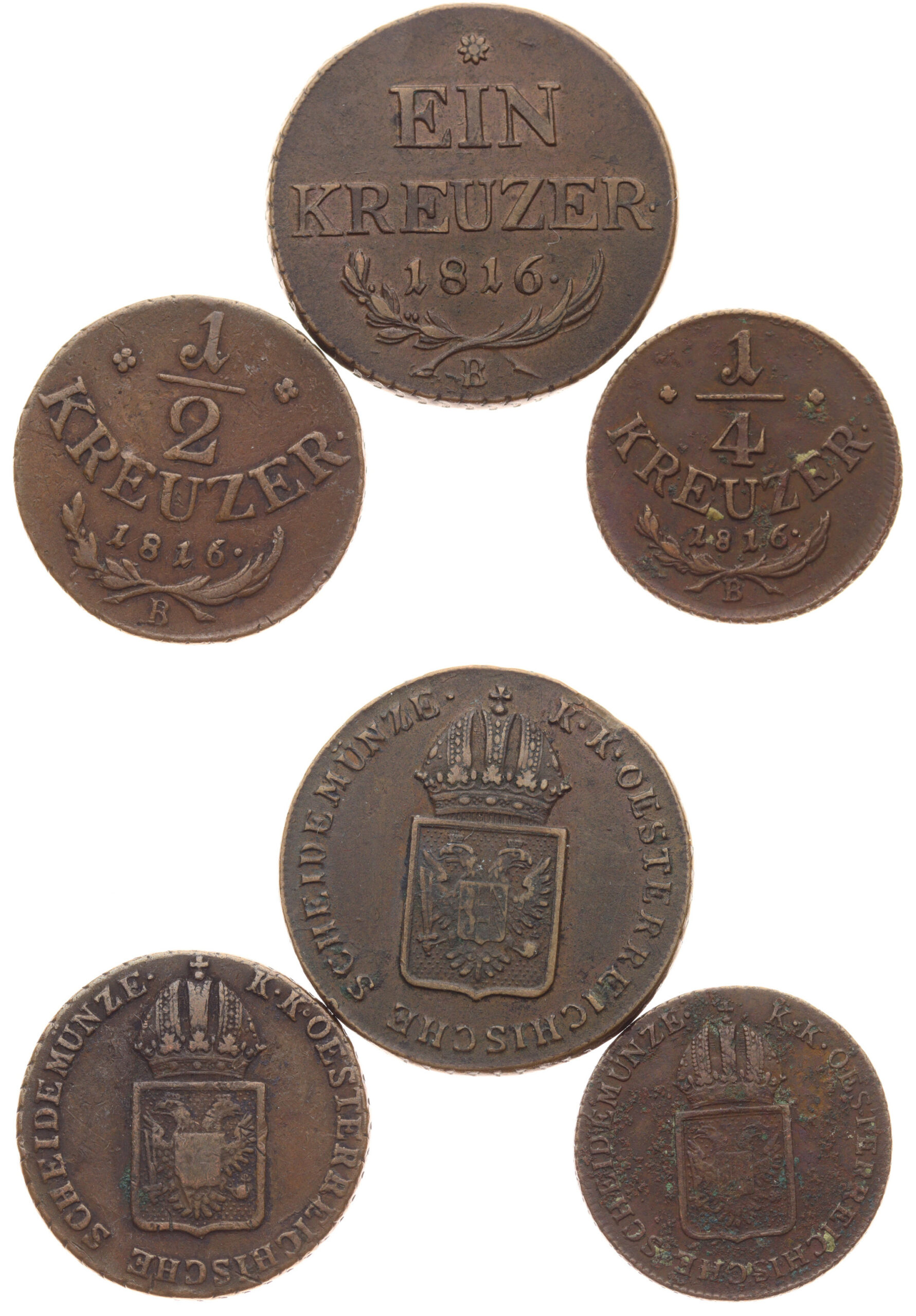 1+1/2+1/4 Krejcar, 1816 B, Cu mince, váha 8,75/4,38/2,19 gramu, Ves.61/62/63, stavy1, viz autentické foto