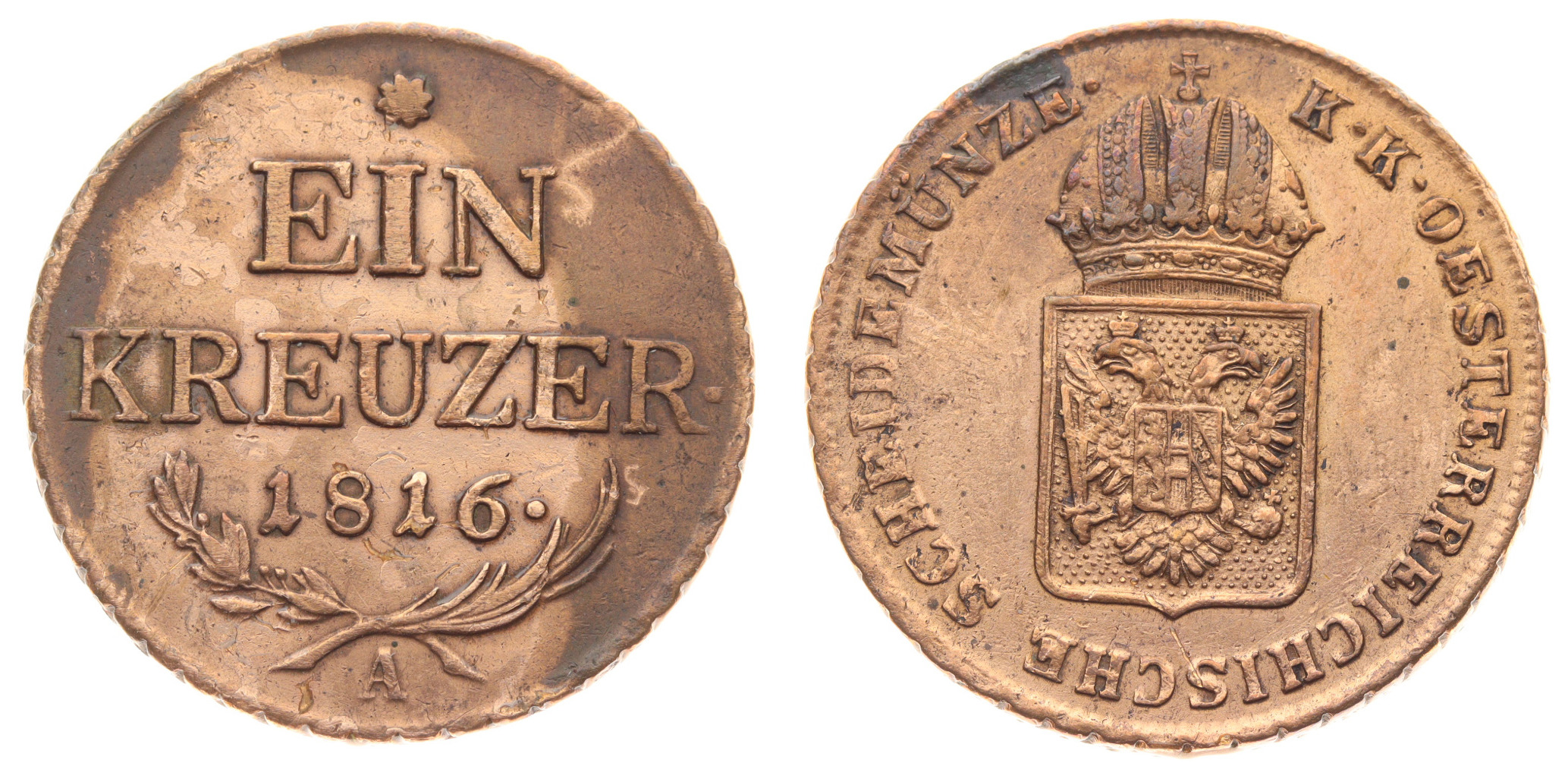 1 Krejcar, 1816 A, Cu mince, váha 4,38 gramu, Ves.62 , stav 1/1, viz autentické foto