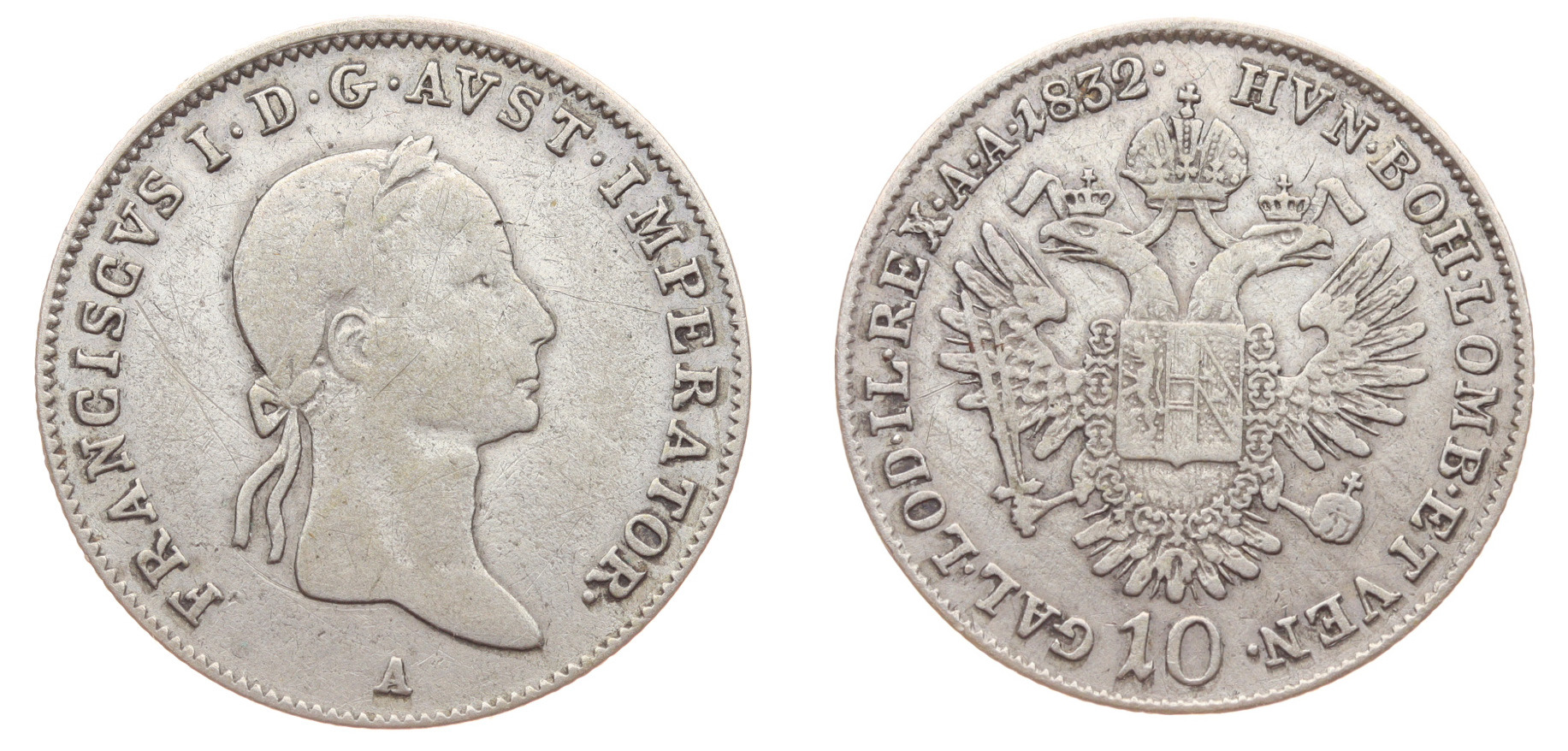 10 Krejcar, 1832 A, Ag mince, váha 3,99 gramu, Ves.49 , stav -1/1, viz autentické foto
