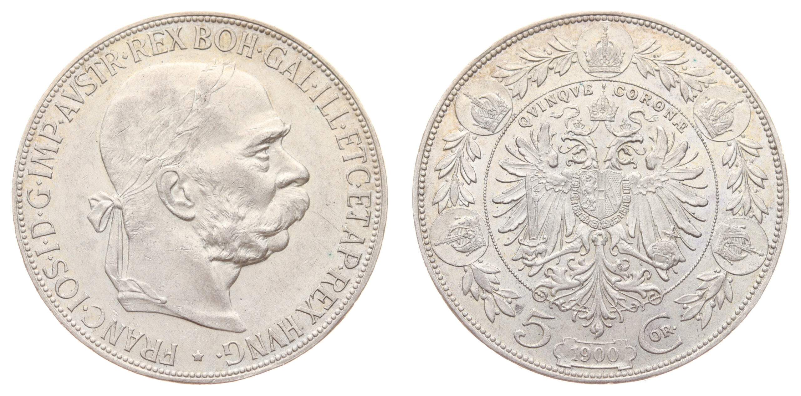 5 Korun, 1900, Ag mince, váha 24 gramů, Ves.127, zbytky ražebního lesku v plochách, stav -0/0-, viz autentické foto