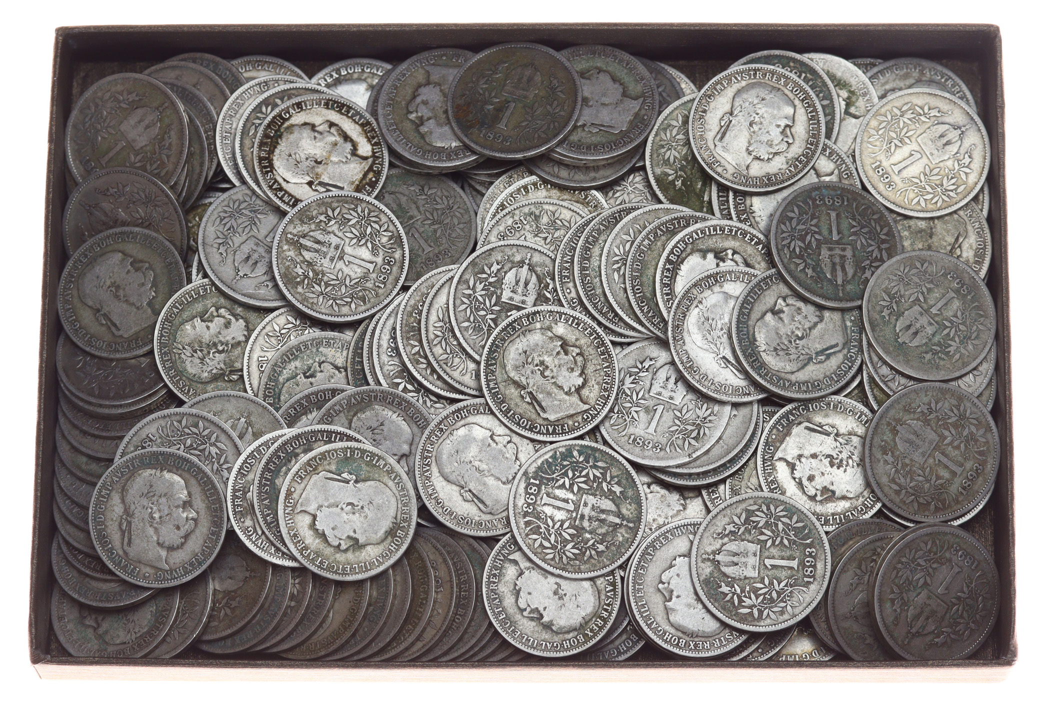 200 kusů mincí 1 Koruna, 1893, vše Ag mince, váha á 5 gramů, vyšší katalog, slušná oběhová jakost – viz autentické foto