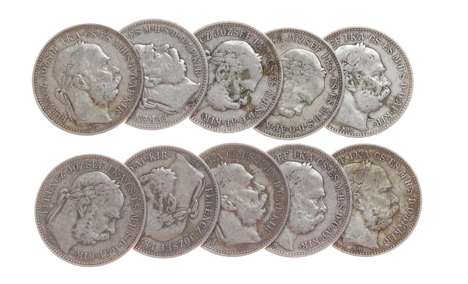 10 kusů mincí 1 Koruna, 1896 KB, vše Ag mince, váha á 5 gramů, slušná oběhová jakost – viz autentické foto