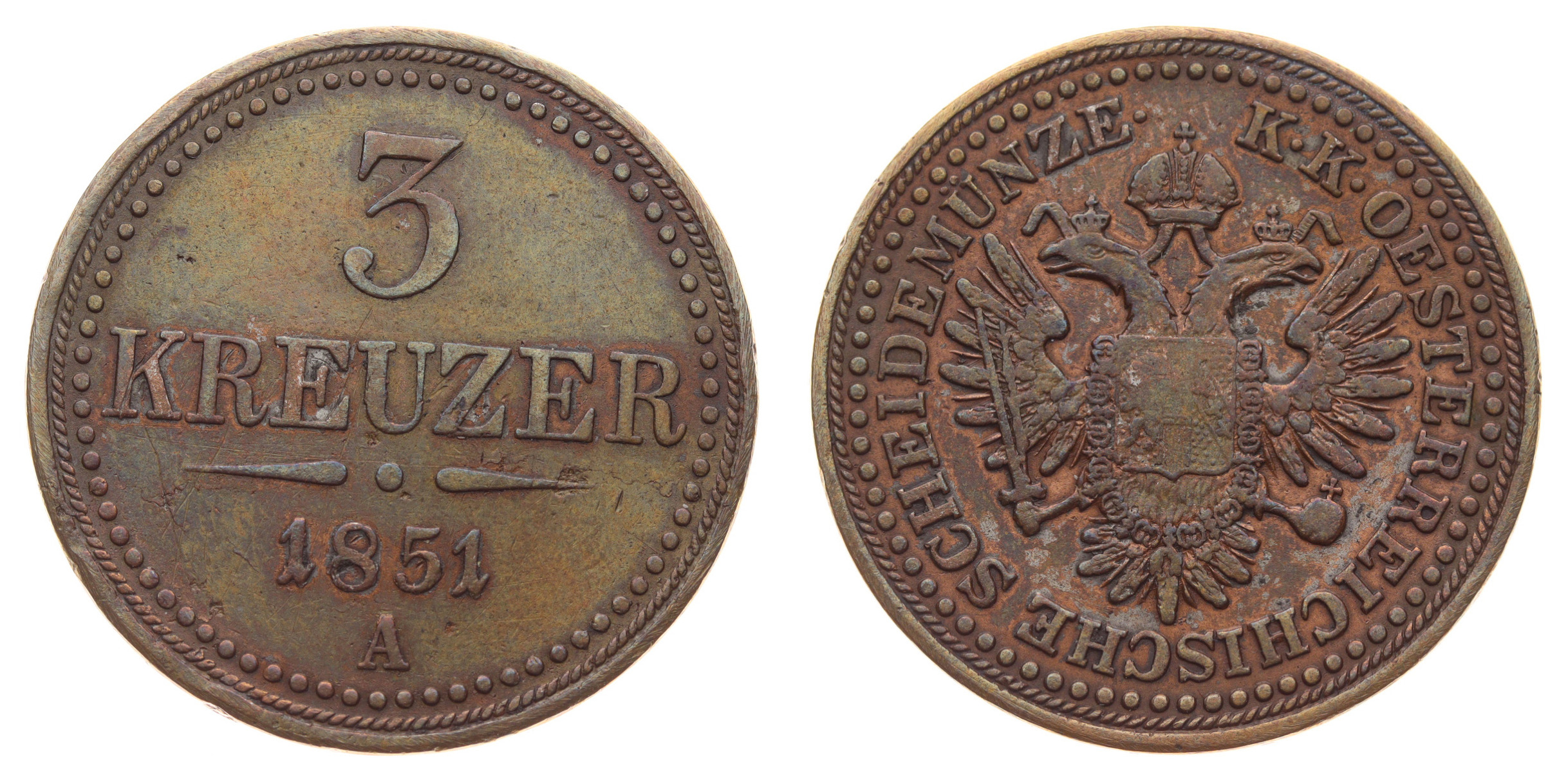 3 Krejcar, 1851 A, Cu mince, váha 16,41 gramu, Ves.12 , stav 1/1, viz autentické foto