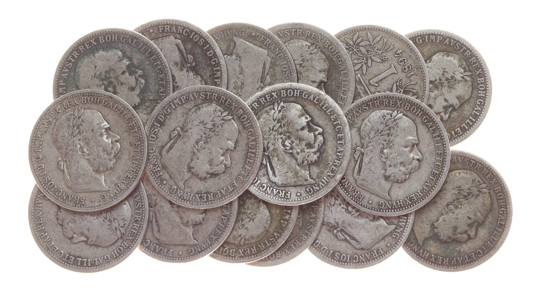 16 kusů mincí 1 Koruna, 1894, vše Ag mince, váha á 5 gramů, slušná oběhová jakost – viz autentické foto