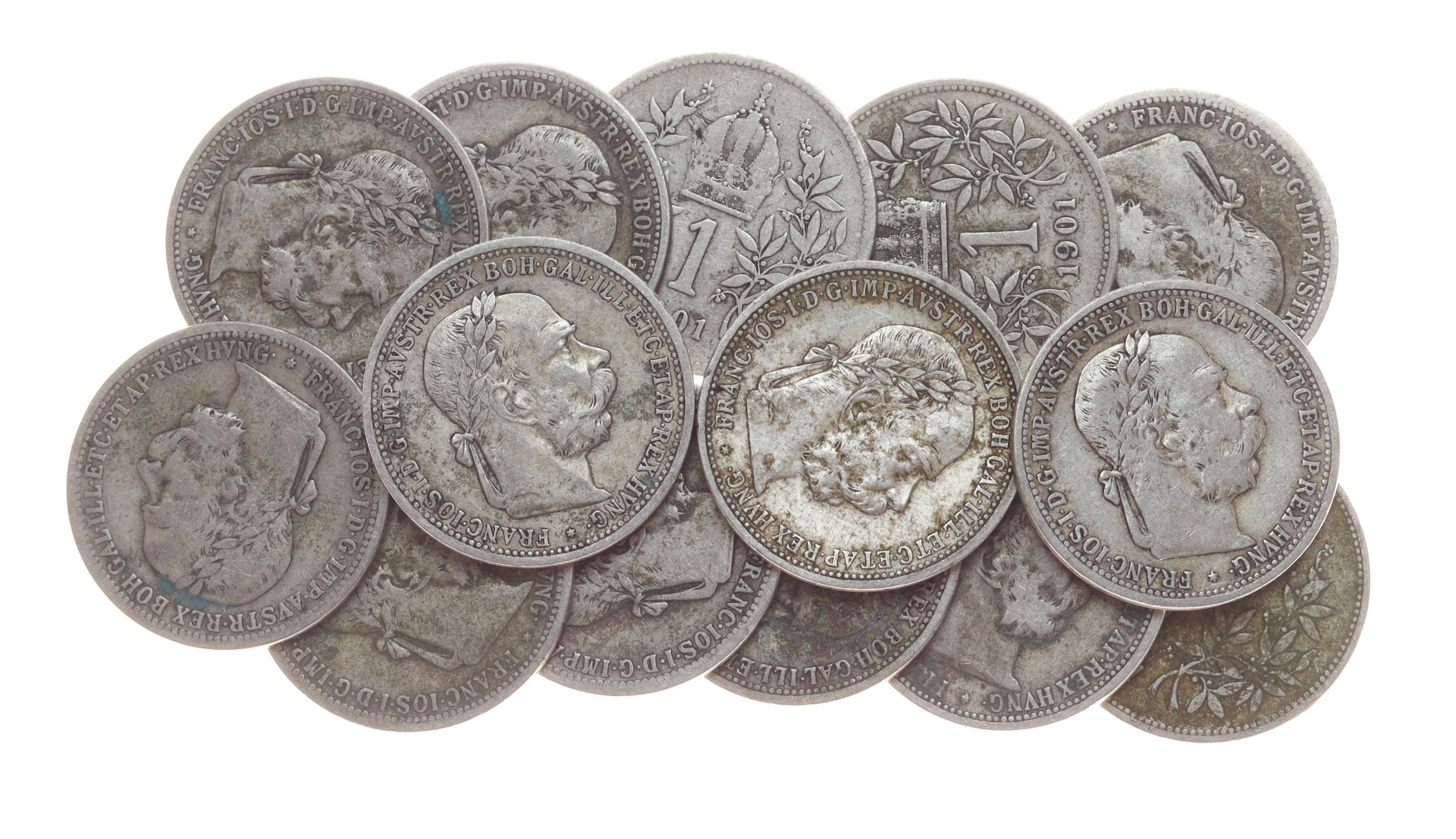 14 kusů mincí 1 Koruna, 1901, vše Ag mince, váha á 5 gramů, slušná oběhová jakost – viz autentické foto