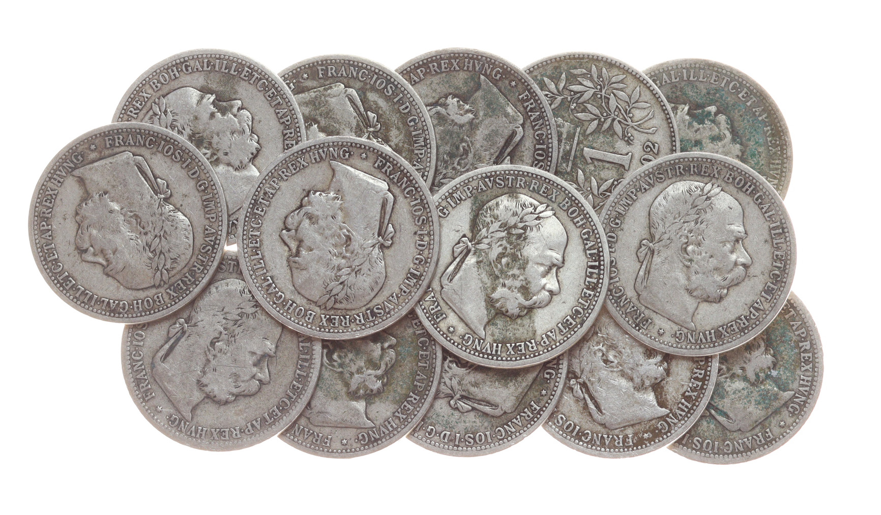 14 kusů mincí 1 Koruna, 1902, vše Ag mince, váha á 5 gramů, vyšší katalog, slušná oběhová jakost – viz autentické foto
