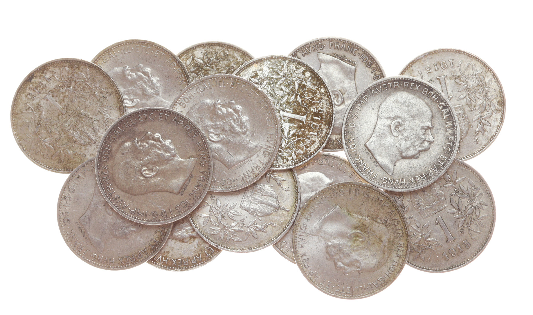 15 kusů mincí 1 Koruna, 1915, vše Ag mince, váha á 5 gramů, slušná oběhová jakost – viz autentické foto