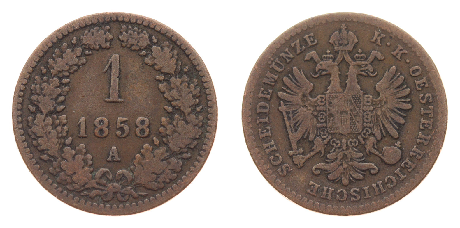 1 Krejcar, 1858 A, Cu mince, váha 3,33 gramů, Ves. 81, stav 1/1, viz autentické foto