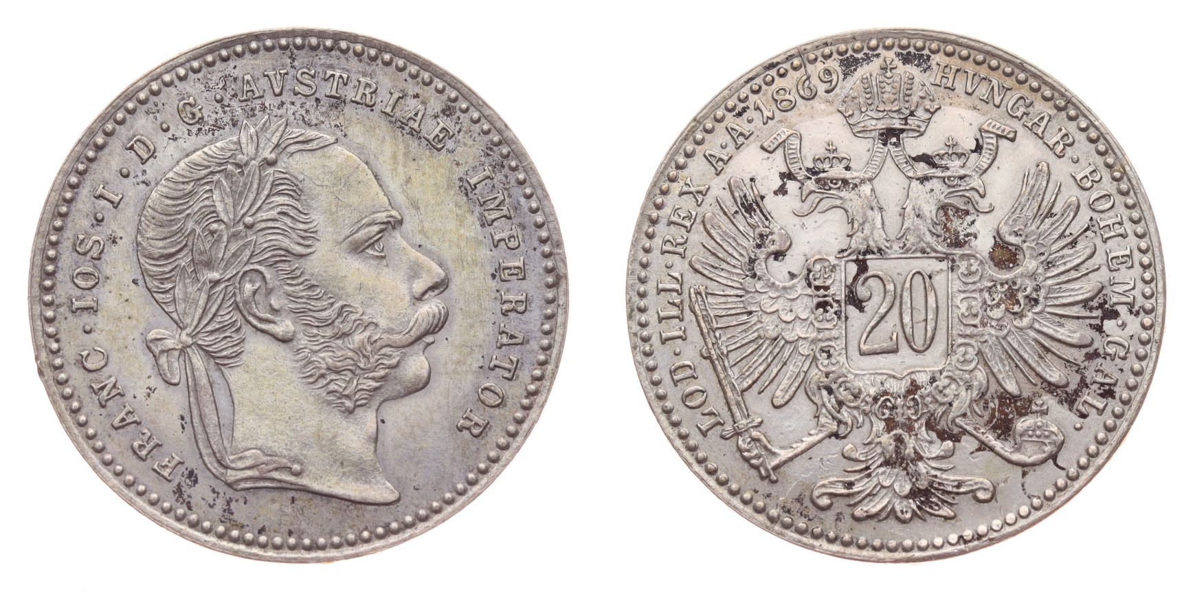 20 Krejcar, 1869, Ag mince, váha 2,66 gramu, Ves.74, krásný stav -0/0-, viz autentické foto