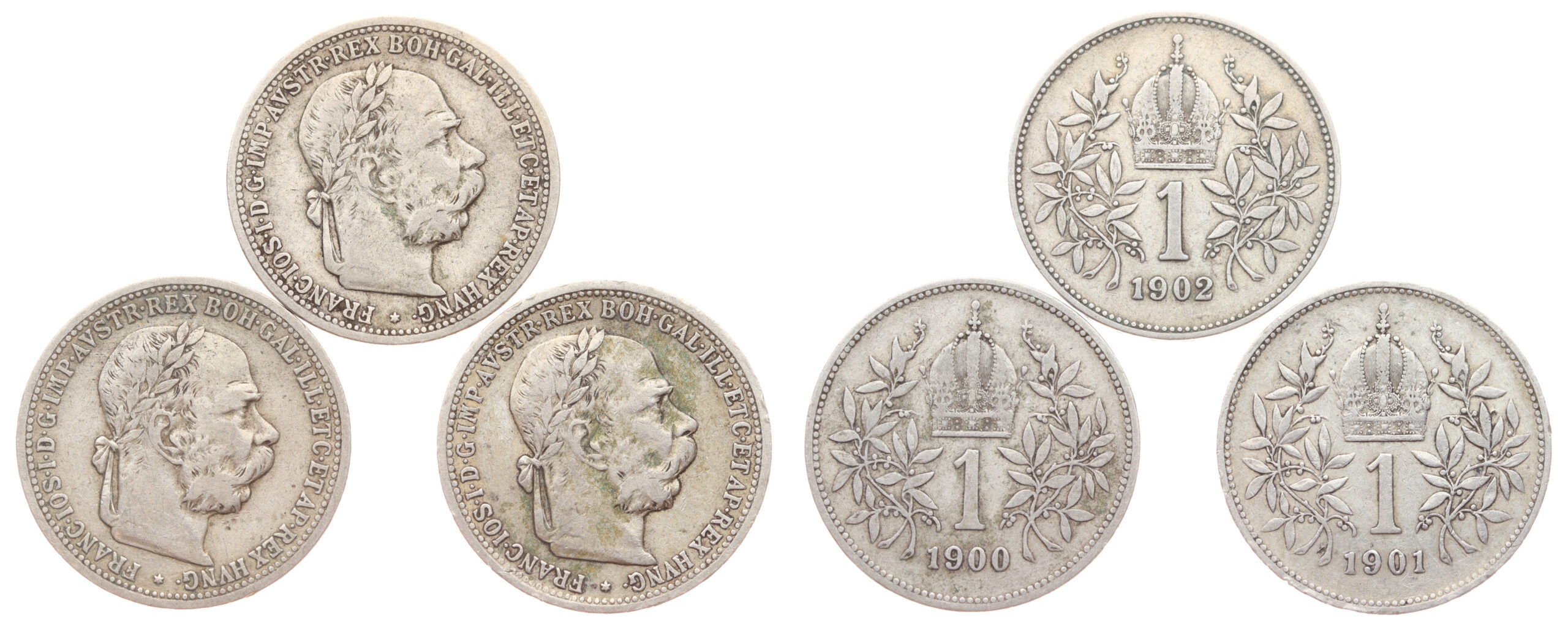 1 + 1 + 1 Koruna 1900/1901/1902 , Ag mince, váha á 5 gramů, slušné oběhové stavy – viz autentické foto