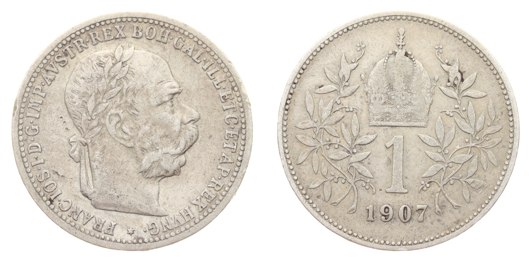 1 Koruna, 1907, Ag mince, váha 5 gramů, Ves. 132, stav 1/1-, viz autentické foto