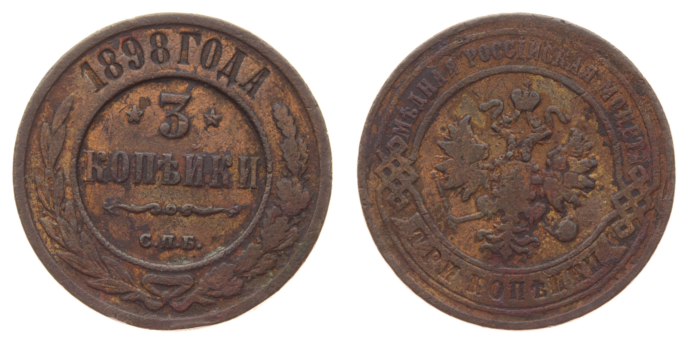3 Kopějky, 1898 S.P.B, Cu mince, váha 9,8 gramu, stav 1/1, viz autentické foto
