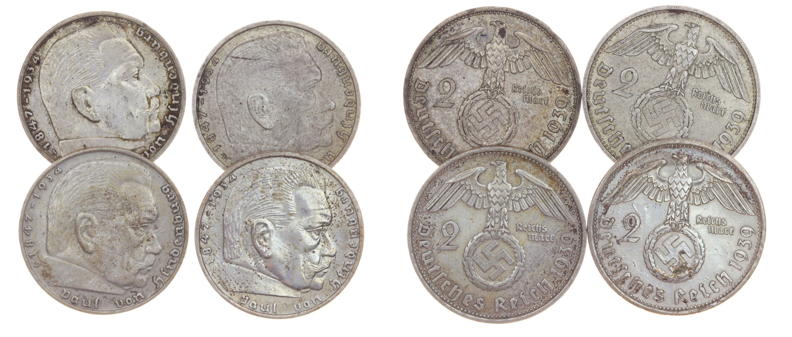 sestava 4 kusů Ag mincí 2 Reichsmark, 1939, , pěkné stavy 0-1…viz.autentické foto