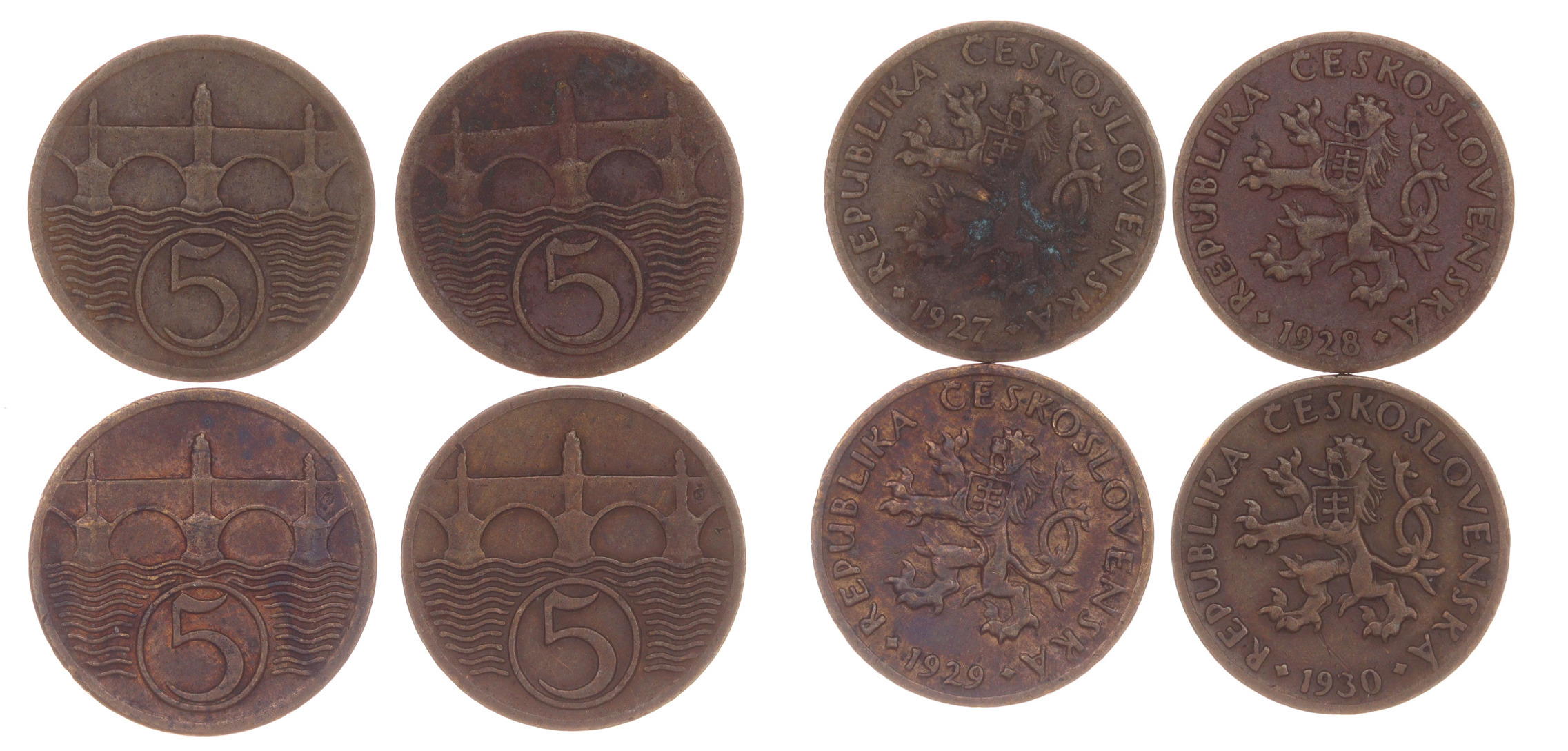 4 kusy mince 5 Haléř, 1927, 1928, 1929 a 1930, váha á 1,67 gramů, Aurea 2, stavy 1-2, viz autentické foto
