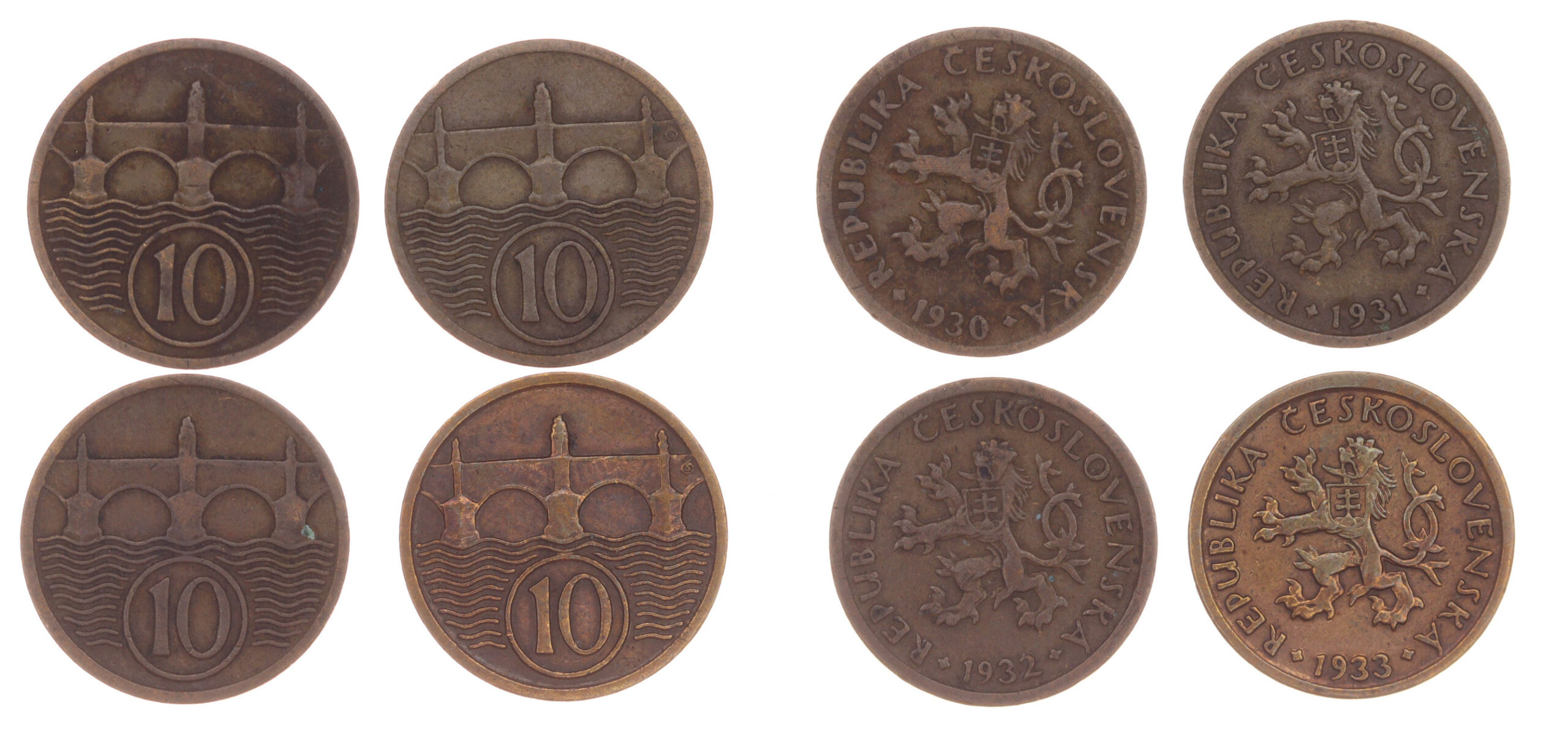 4 kusy mince 10 Haléř, 1930, 1931, 1932 s 1933, váha á 2 gramy, Aurea 3, stavy 1-2, viz autentické foto