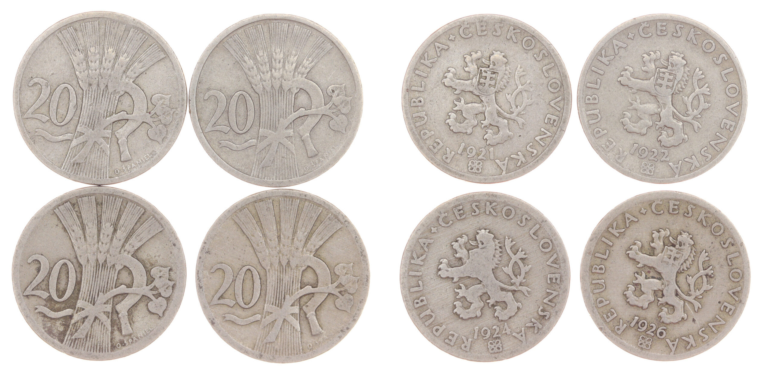 4 kusy mince 20 Haléř, 1921, 1922, 1924 a 1926, váha á 3,33 gramu, Aurea 4, stavy 1-2, viz autentické foto