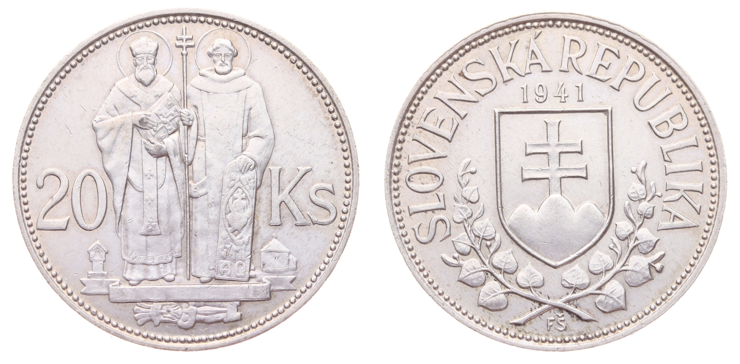 20 Koruna, 1941 v, varianta s dvojkřížem na rotundě, Ag mince, ryzost 0,500, váha 15 gramů, Aurea 33, jemná patina, ražební lesk, stav +1/1+, ojedinělý výskyt