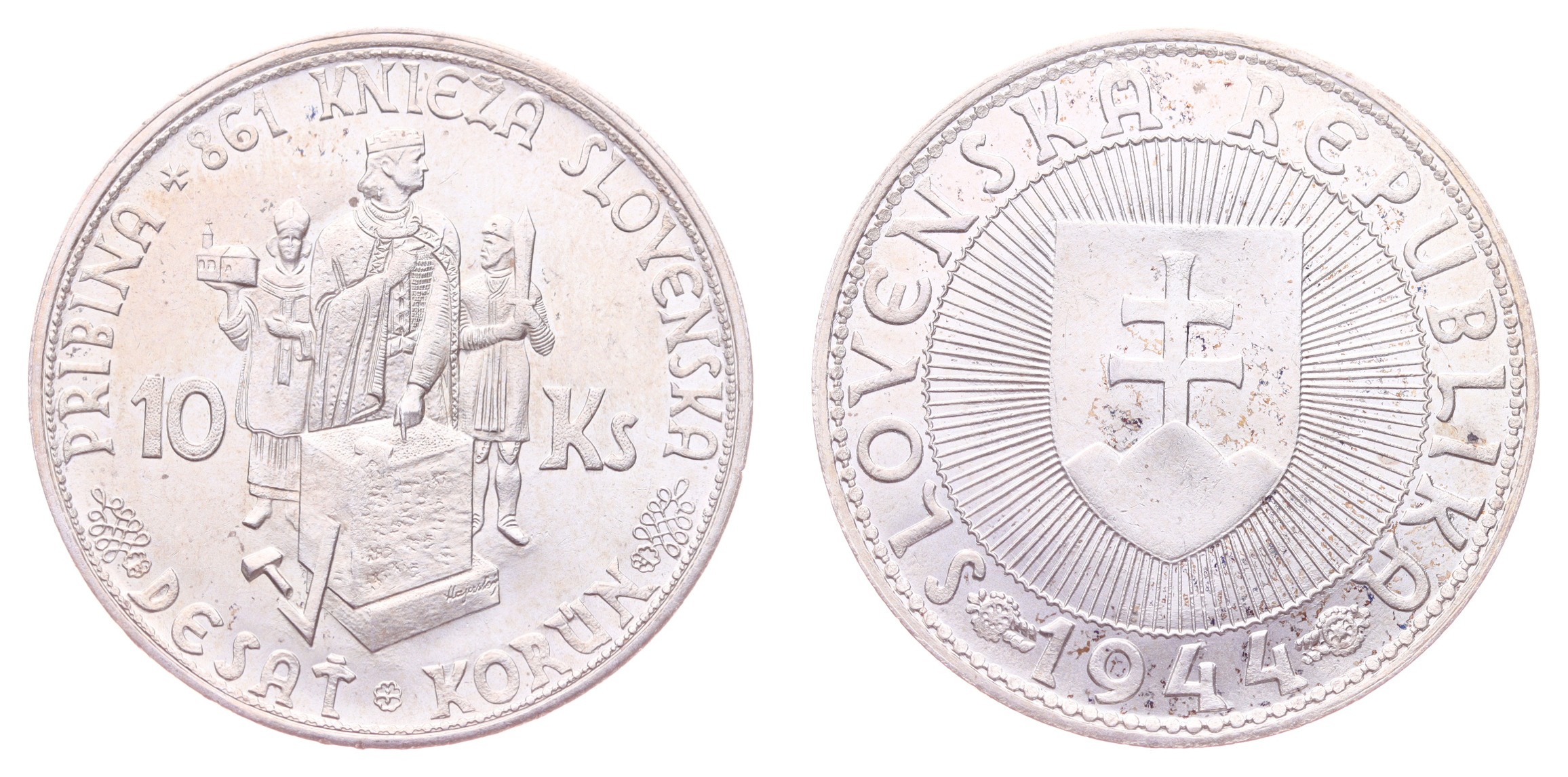 10 Koruna, 1944, Ag mince, ryzost 0,500, váha 7 gramů, Aurea 32, jemná patina, kapsle, ražební lesk, stav -0/0-