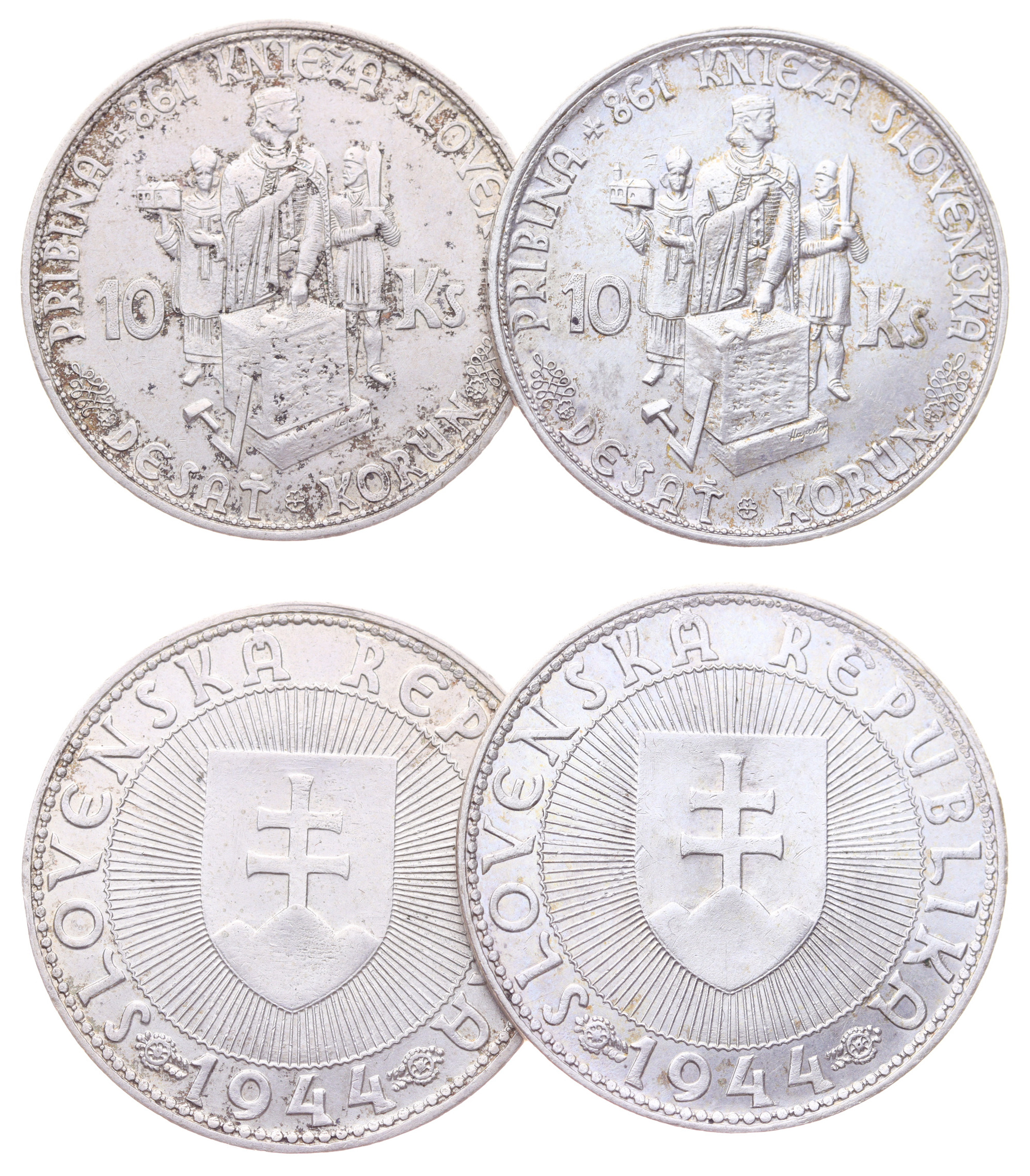 10 + 10 Koruna, 1944 (obě varianty) , Ag mince, ryzost 0,500, váha a7 gramů, Aurea 32, jemná patina, kapsle, ražební lesk, stav -0 až 1