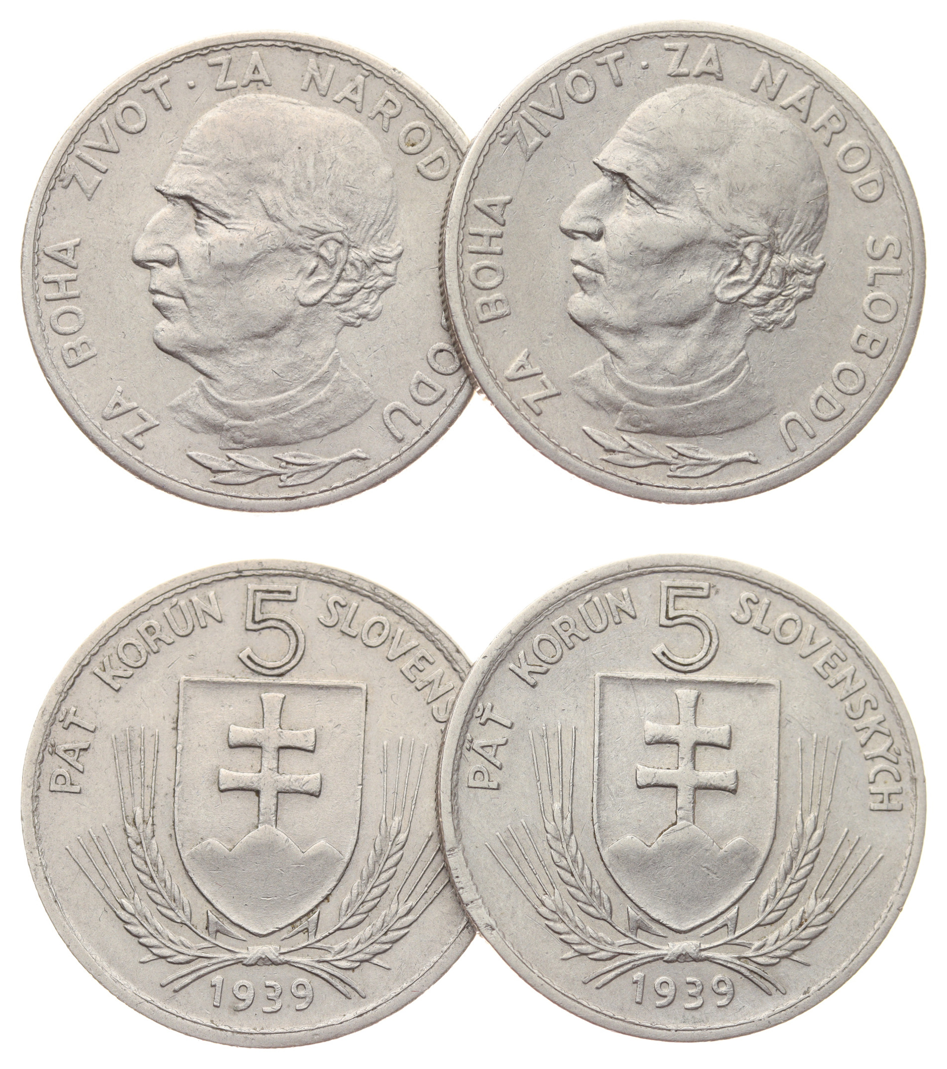 5+5 Koruna, 1939/1939 v – obě varianty, váha á 8 gramů, Ves.31, stavy +1/1+, viz autentické foto