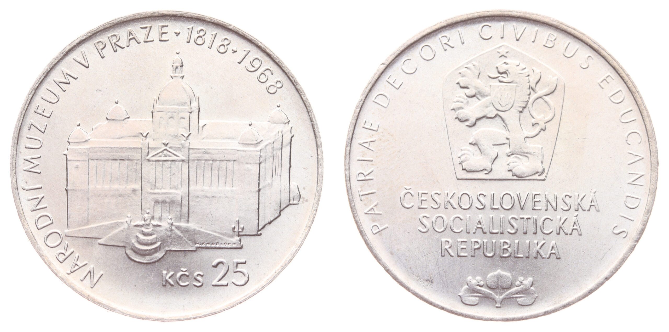 25 Koruna, 1968, Národní muzeum, Ag mince, ryzost 0,500, váha 16 gramů, Aurea 114, kapsle, jemná patina, ražební lesk, stav -0/0-