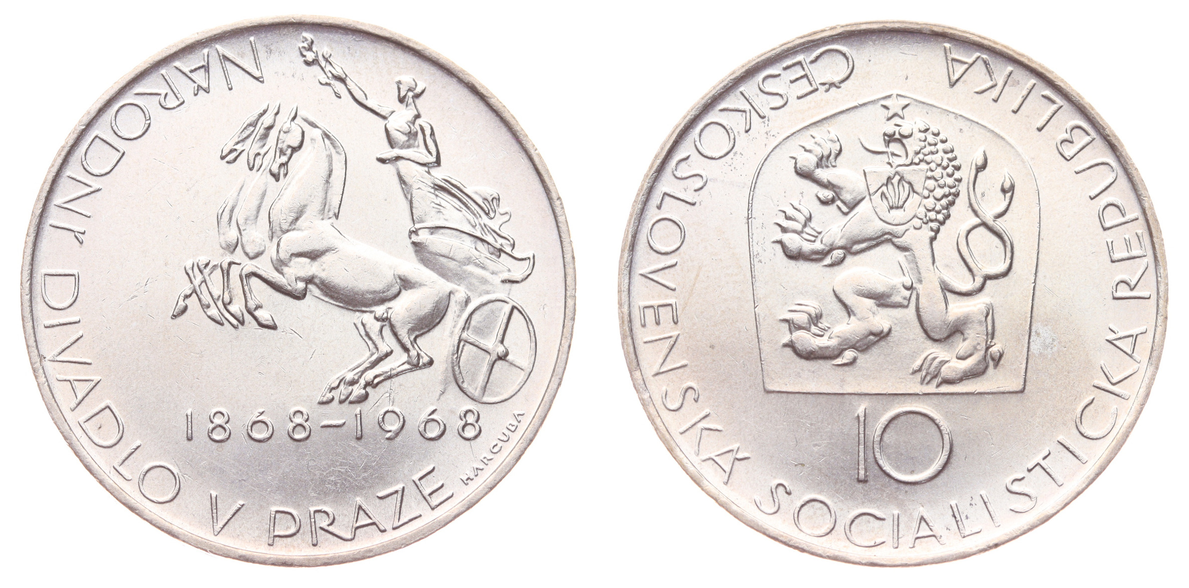 10 Koruna, 1968, Národní divadlo, Ag mince, ryzost 0,500, váha 12 gramů, Aurea 115, kapsle, jemná patina, ražební lesk, stav -0/0-