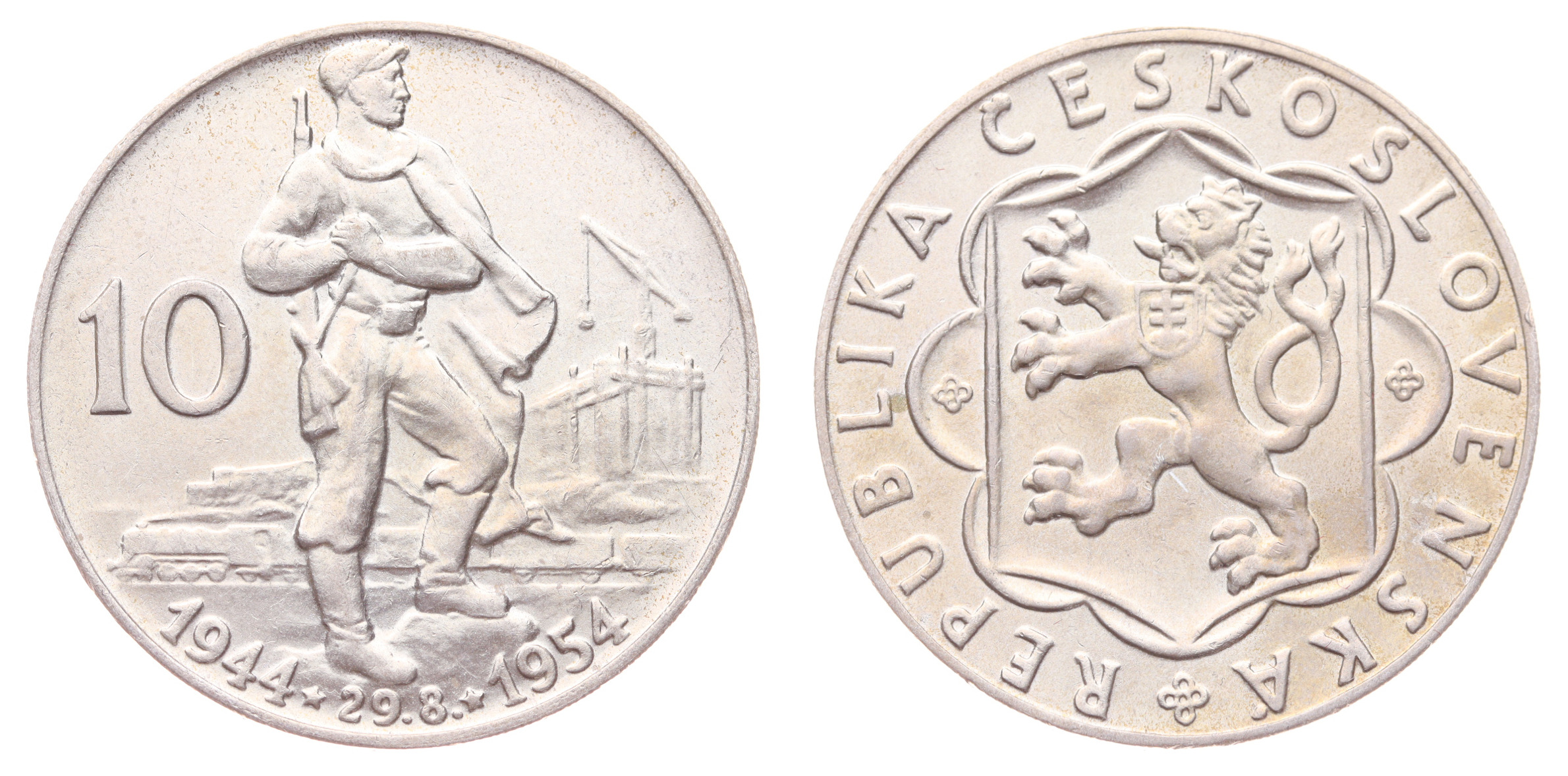 10 Koruna, 1954, 10.výročí SNP, Ag mince, ryzost 0,500, váha 12 gramů, Aurea 101, kapsle, jemná patina, ražební lesk, stav -0/0-