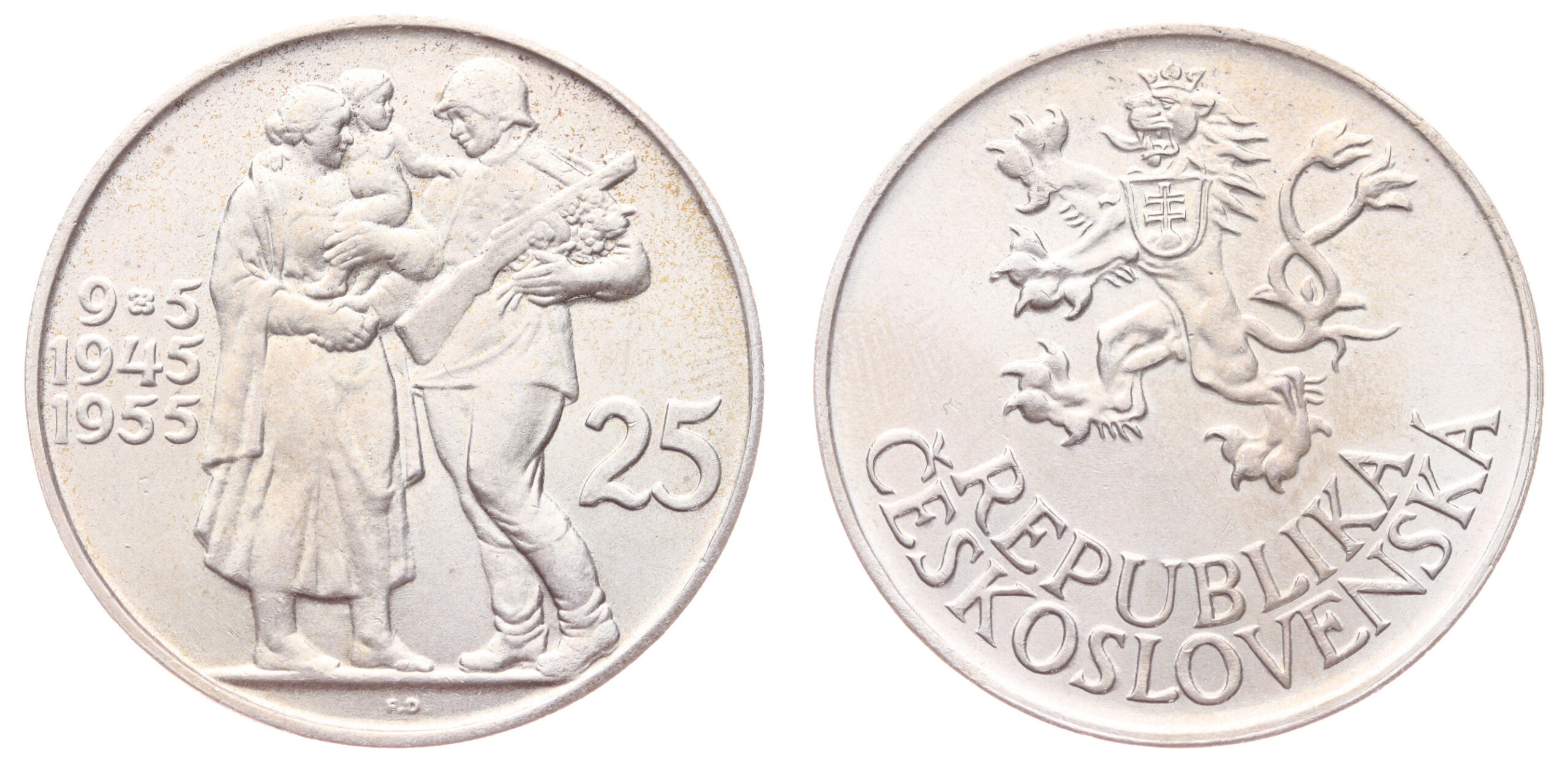 25 Koruna, 1955, Osvobození Československa, Ag mince, ryzost 0,500, váha 16 gramů, Aurea 104, kapsle, jemná patina, ražební lesk, stav 0/0