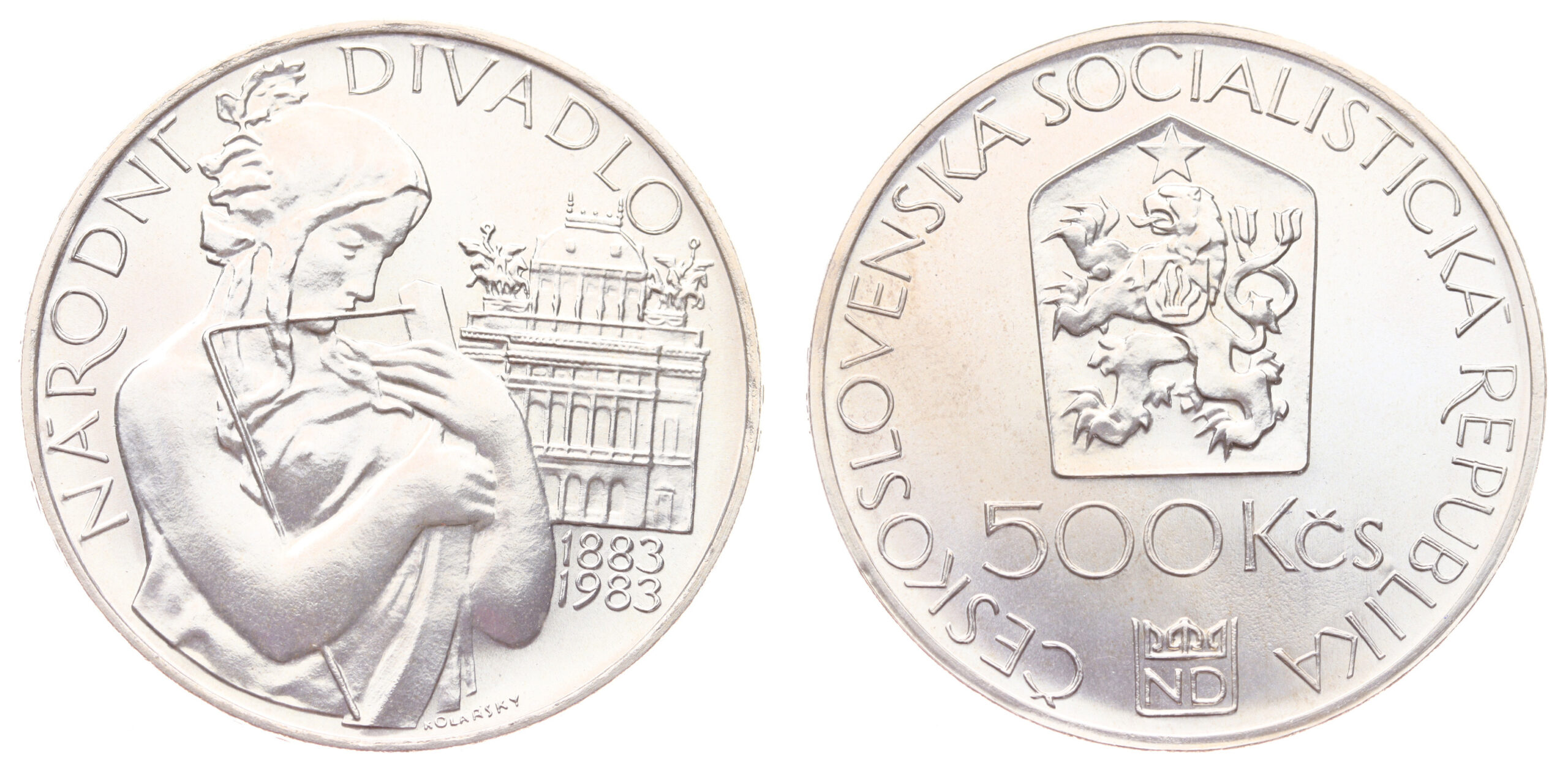 500 Koruna, 1983 v ( varianta podpisu autora KOLAŘSKY), Národní divadlo, Ag mince, ryzost 0,900, váha 24 gramů, Aurea 154, kapsle, ražební lesk, stav 0/0 – zcela ojedinělý výskyt
