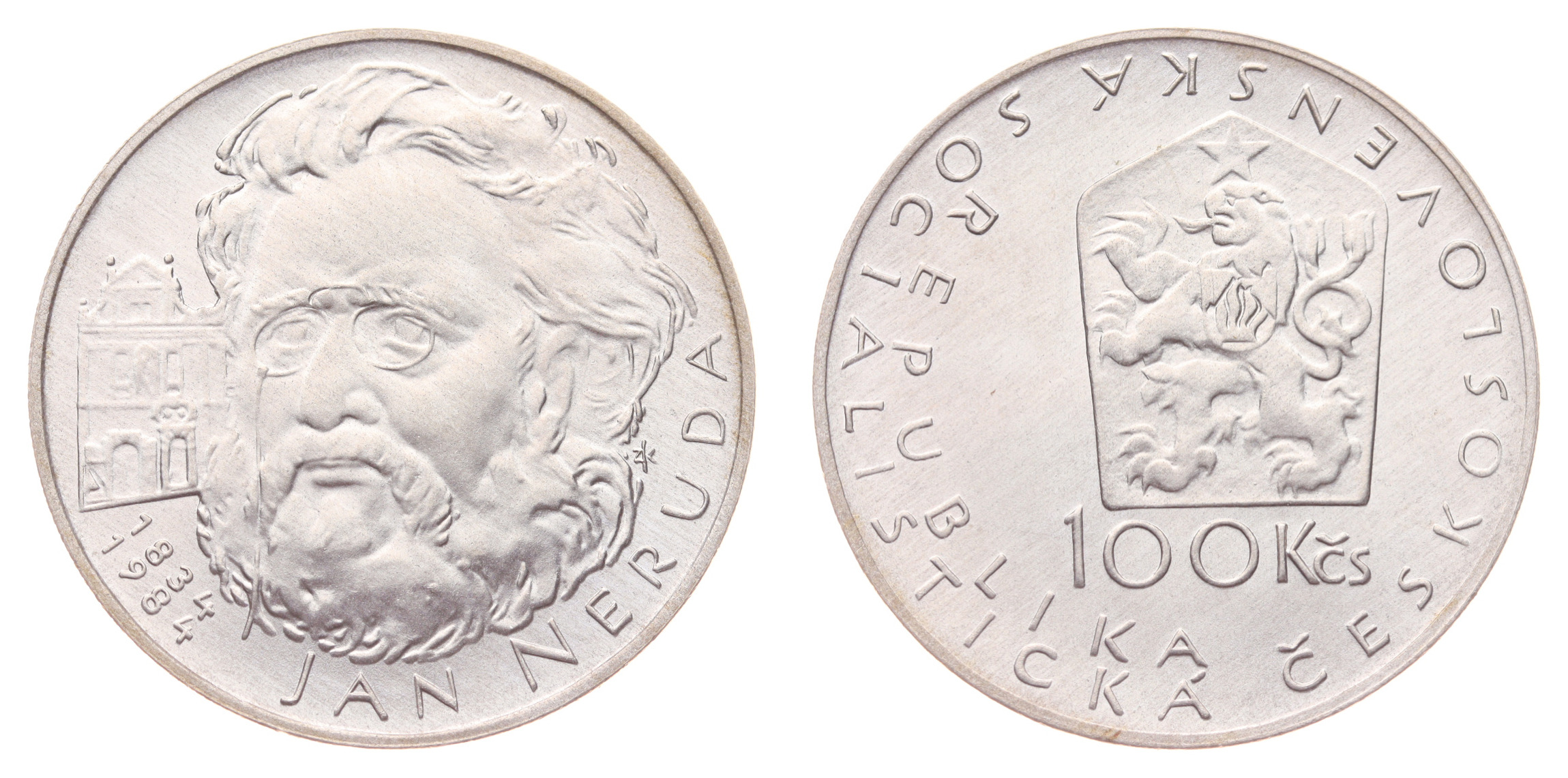 100 Koruna, 1984, J.Neruda, Ag mince, ryzost 0,500, váha 9 gramů, Aurea 156, kapsle, jemná patina, ražební lesk, stav 0/0