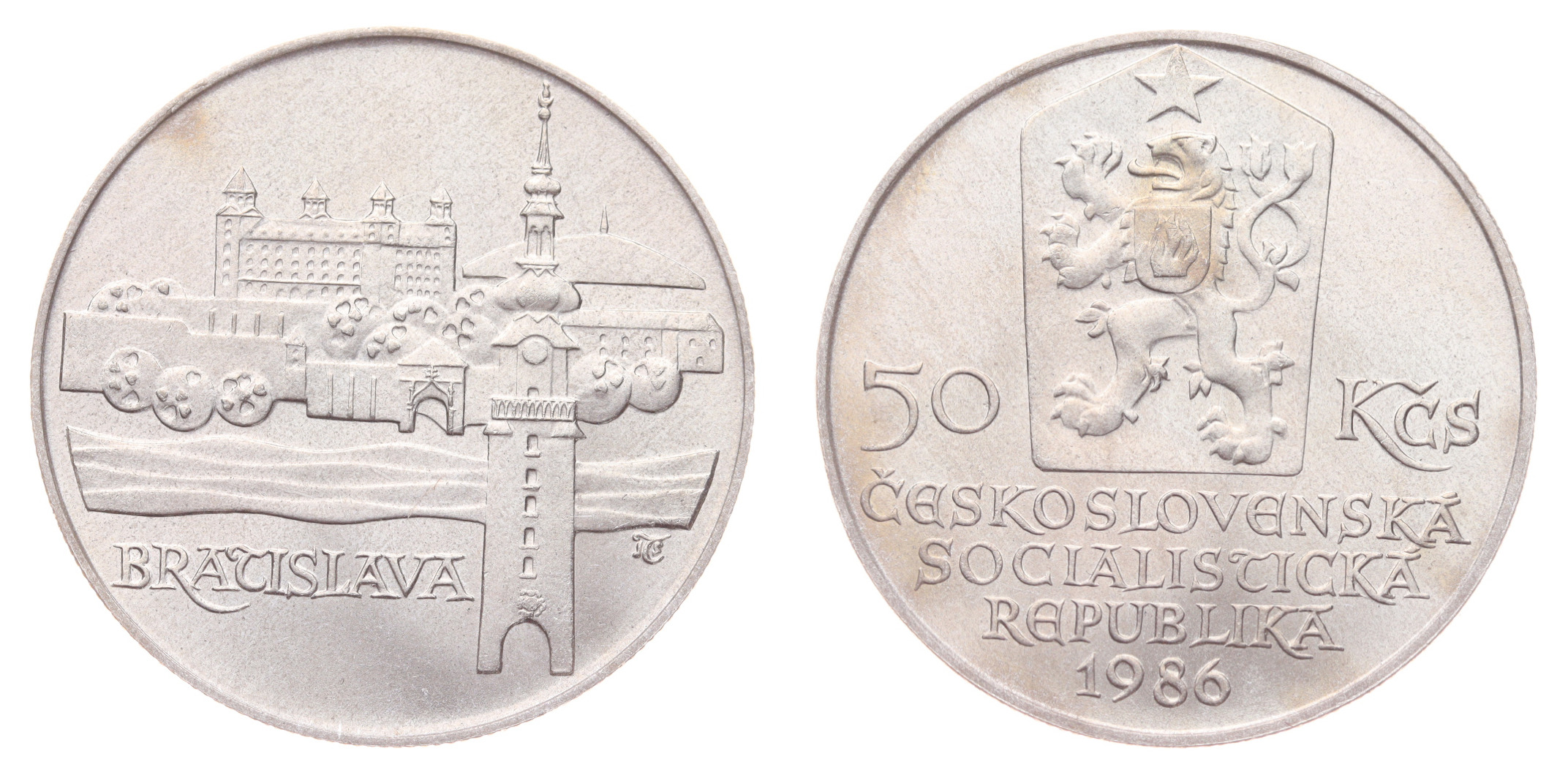 100 Koruna, 1986, Bratislava, Ag mince, ryzost 0,500, váha 7 gramů, Aurea 165, kapsle, jemná patina, ražební lesk, stav 0/0