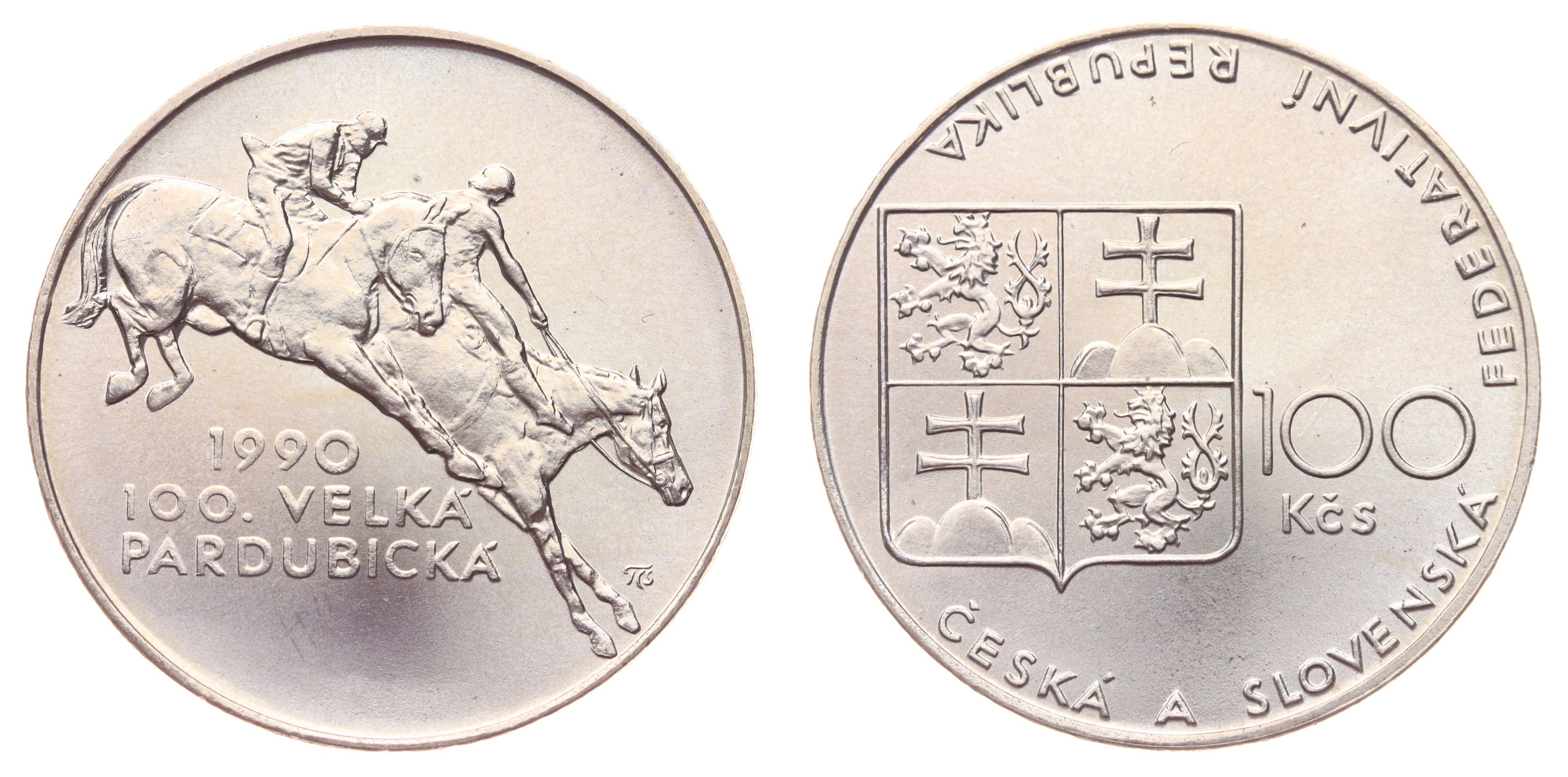 100 Koruna, 1990, Velká pardubická, Ag mince, ryzost 0,500, váha 13 gramů, Aurea 183, kapsle, jemná patina, ražební lesk, stav 0/0