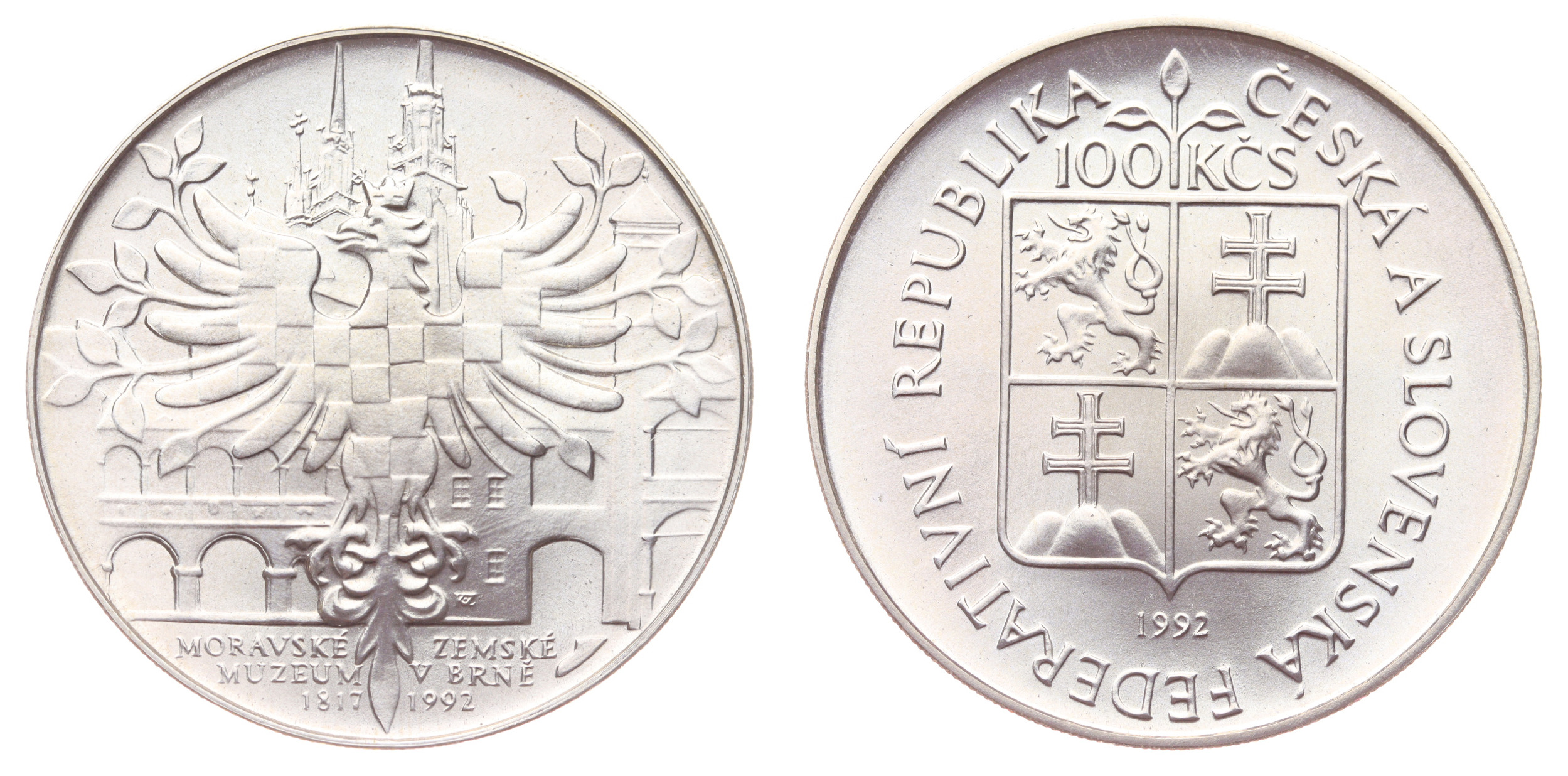 100 Koruna, 1992, Moravské zemské muzeum v Brně, Ag mince, ryzost 0,700, váha 13 gramů, Aurea 194, kapsle, ražební lesk, stav 0/0